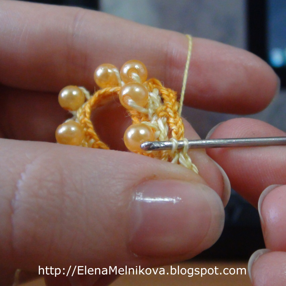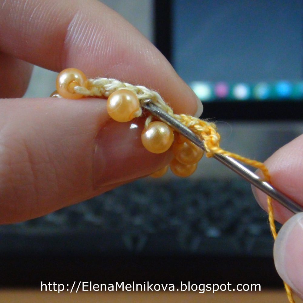 В третьем ряду мы будем уже вязать используя наши бусинки. Вот так.