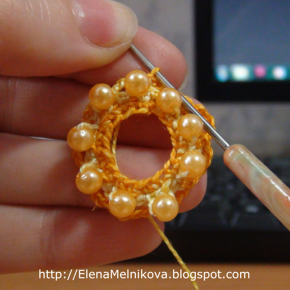 Провязываем таким образом чередуя столбики без накида с бусинами и без до конца круга.