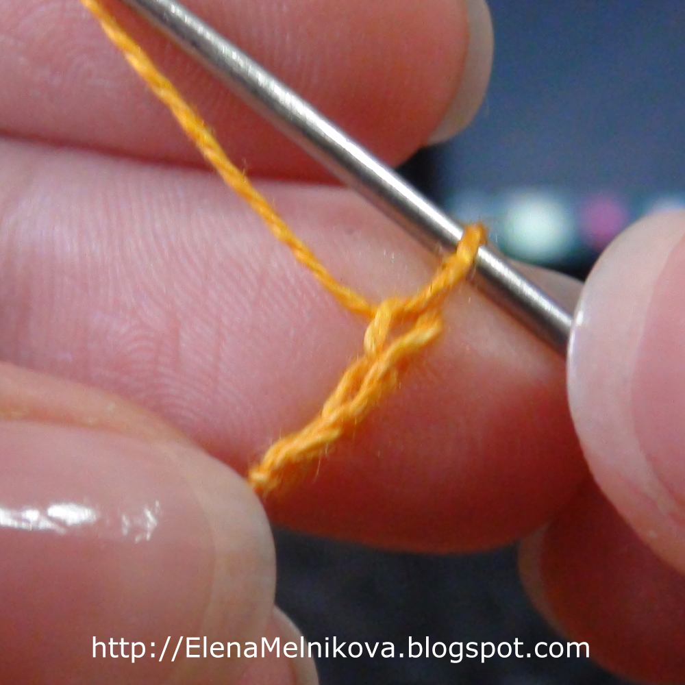 Захватываем рабочую нить, протягиваем сквозь следующие две петли на крючке.