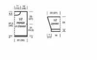 Перед: вязать как спинку, но через 37,5 = 92 ряда (54 см = 110 рядов) от планки закрыть для горловины средние 13 (17) п. и обе стороны закрыть раздельно. Ждя скругления по внутреннему краю закрыть в каждом 2-м ряду 1 х 3 п. 2 х 2 п. и 3 х 1 п. На высоте спинки закрыть оставшиеся 18 (27) петель плеча.