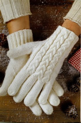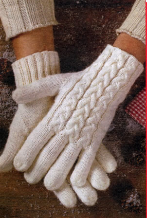Наберите на спицы 64 п., распределите на 4 спицы (на каждой спице по 16 п.). К петлям первой спицы приколите булавку, она будет ориентиром в работе. На 1-й и 2-й спицах - петли верхней части перчатки, на 3- й и 4-й - нижней части (ладонь). Вяжите вкруговую манжет 35 рядов резинкой 1x1. Затем по центру 3-й и 4-й спиц начинайте вязать центральный узор из кос (27 п.), остальные петли вяжите лиц. гладью. Провязав 22 круговых ряда, снимите с 4-й спицы на булавку 8 п. для отверстия для большого пальца. В 23-м ряду прибавьте накидами 8 возд. п. для верхней части пальца. Продолжайте вязание узором и лиц. гладью вкруговую. В 26-м ряду вяжите только лиц. петли.