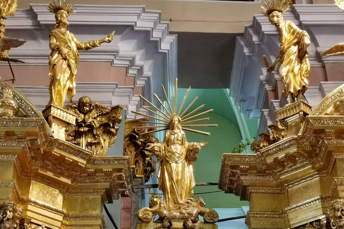 Необычны для традиционного русского культового зодчества как внешний облик собора, так и интерьер. Его главное украшение — резной золоченый иконостас и надпрестольная сень — дар храму от Петра I и Екатерины I. Иконостас был создан в Москве по рисункам Д. Трезини группой мастеров-резчиков под руководством И. П. Зарудного.