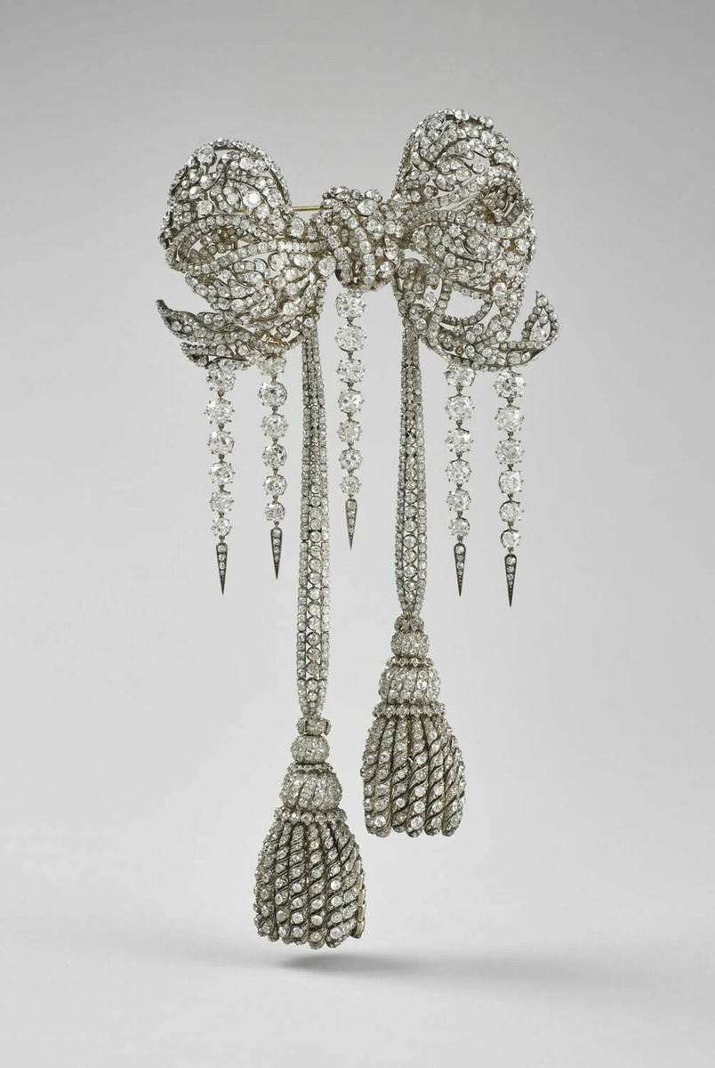 Брошь-бант. Брошь в виде банта с двумя длинными кисточками украшают 2438 бриллиантов и 196 камней огранки «роза». Около 1864 года брошь была переделана из пояса, созданного ювелиром Франсуа Крамером в 1855 году. Этот пояс, украшенный более чем 4000 бриллиантов, императрица надевала 25 августа 1855 года в Версале, на приёме в честь визита королевы Виктории, а затем в 1856 году по случаю крестин своего сына