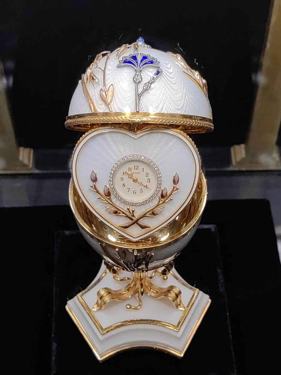 Внутри яйца находится механизм, приводящий в движение часы и будильник. В соответствующее время раздается музыка, под которую Павлин распускает крылья и поворачивает голову.