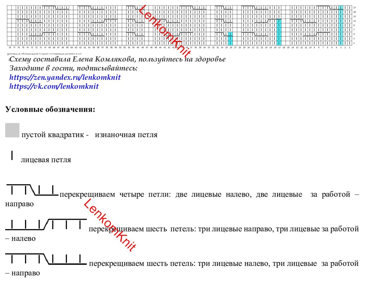 На первой схеме - левая половинка переда, она связана узором из разных жгутов. В этом узоре чередуется три вида жгутов - из четырех, девяти и двенадцати петель. Раппорт каждого отмечен по краю бирюзовым цветом
