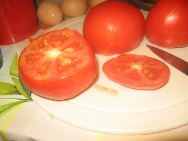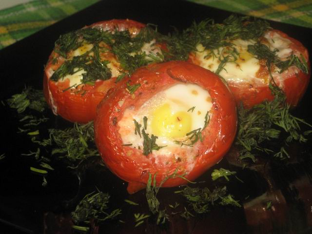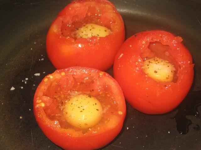 В каждую помидорку влить яйцо. Посолить, поперчить.