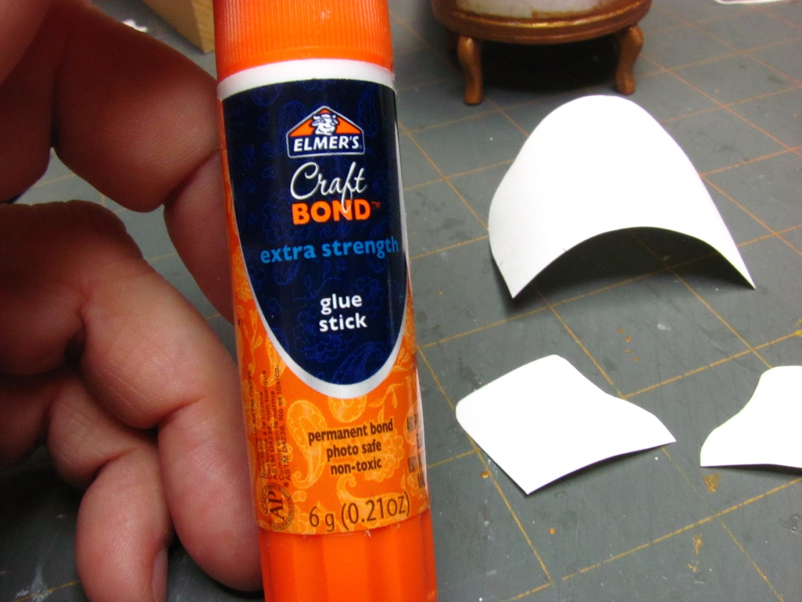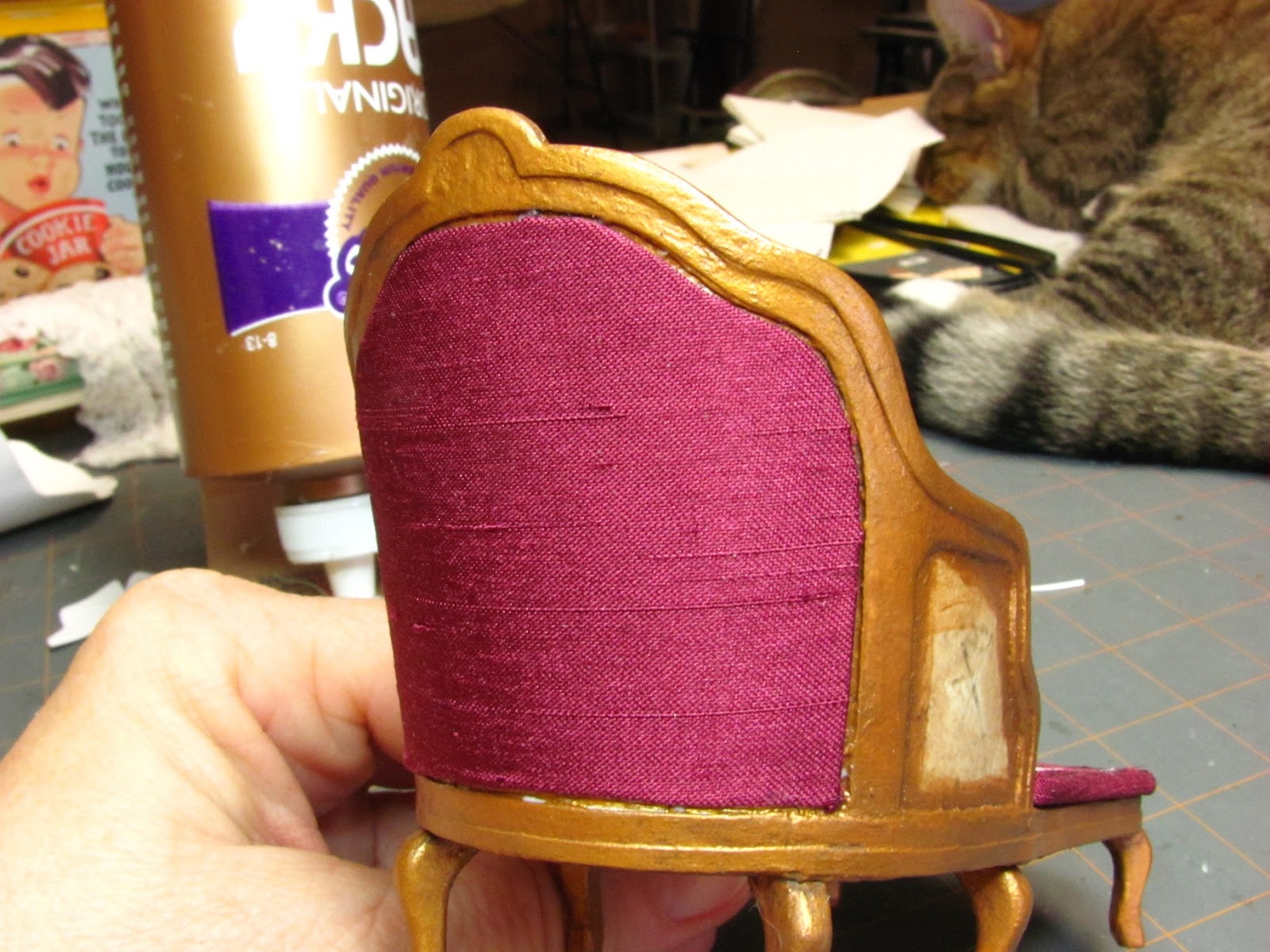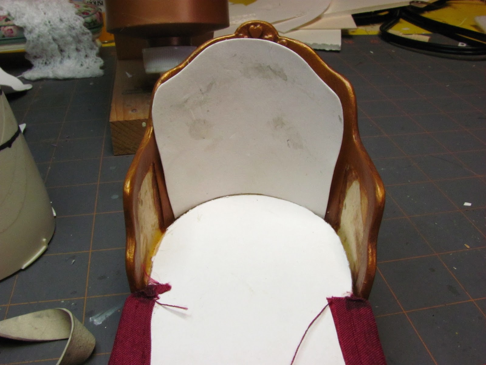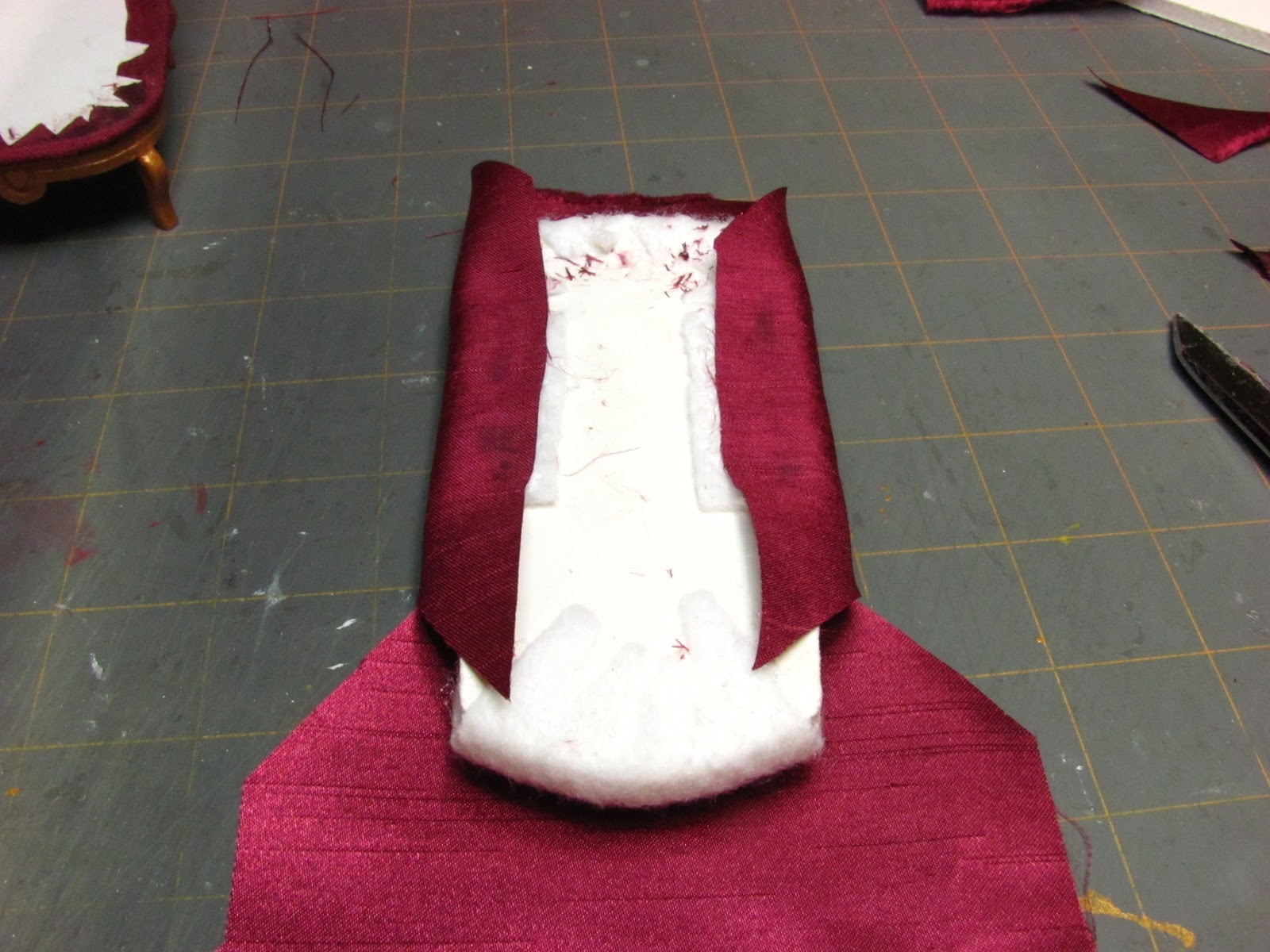 Trim off extra fabric in the seating area and glue the ends down leaving little "ears" of fabric. I apply glue inside these "ears" of fabric.