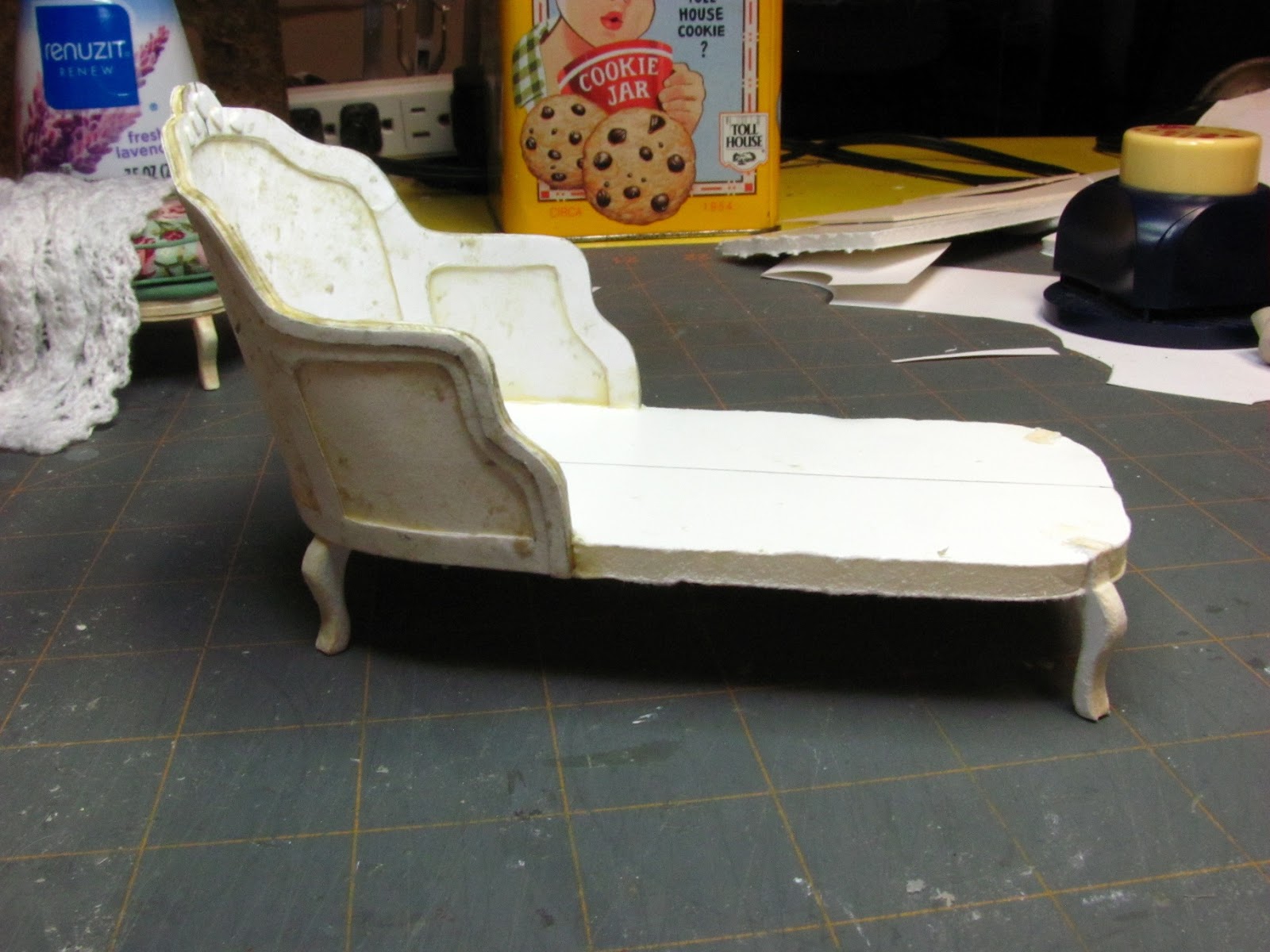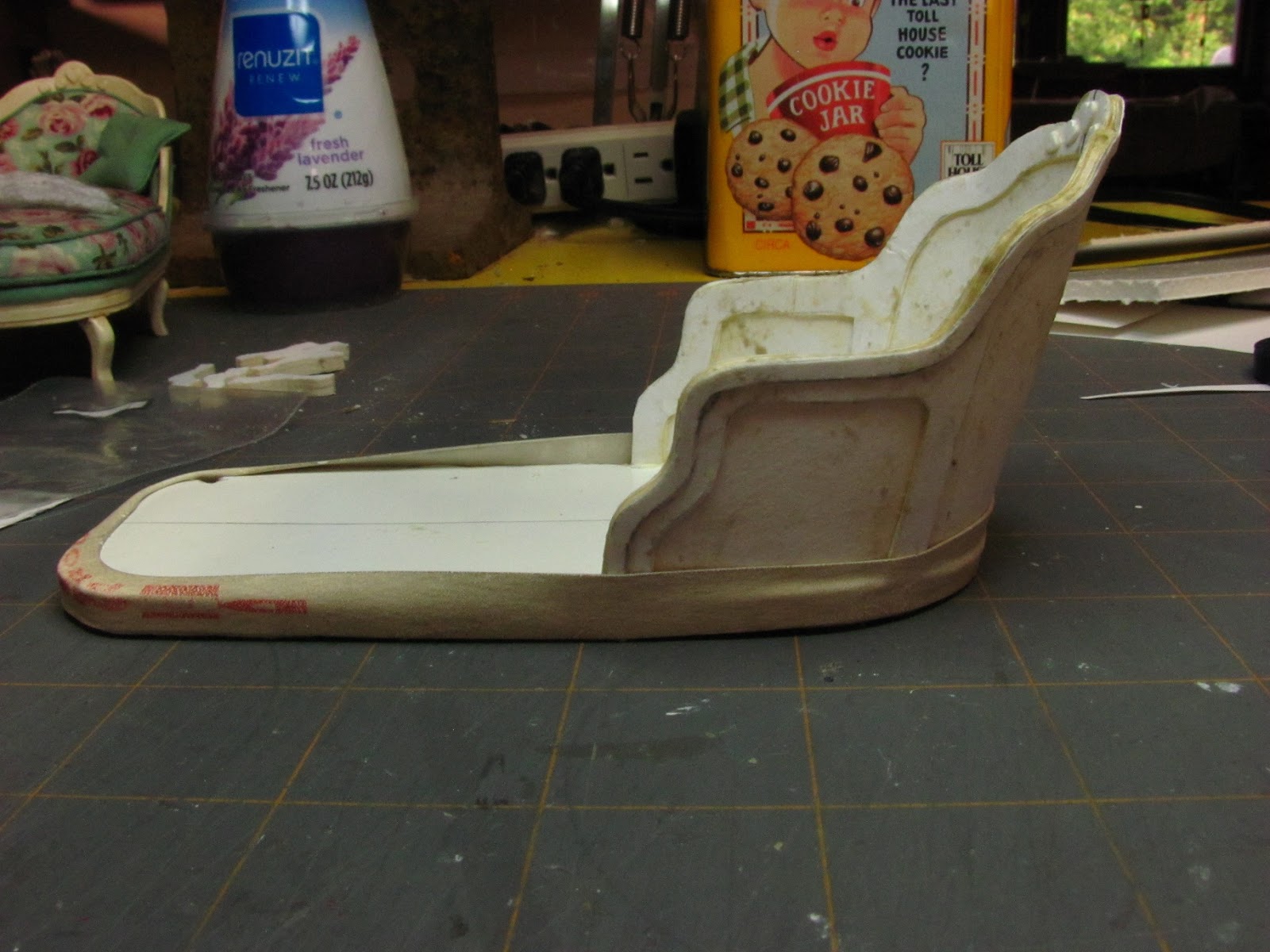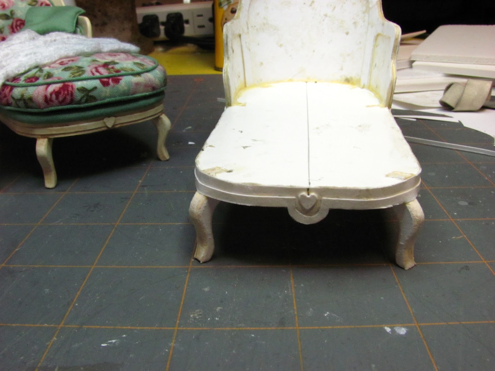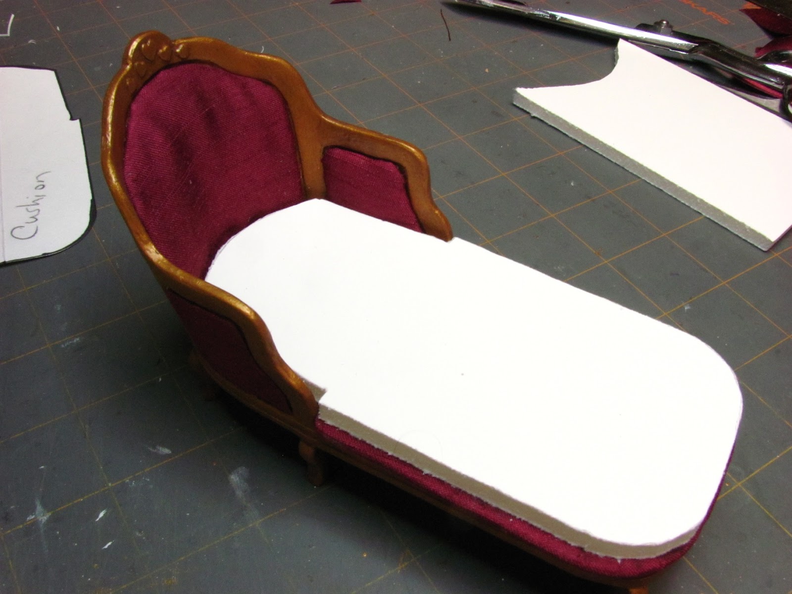 This is the project for this month. This French chaise is made from card stock, foam core and mat board. You could trim off the front of the chaise and make a chair.