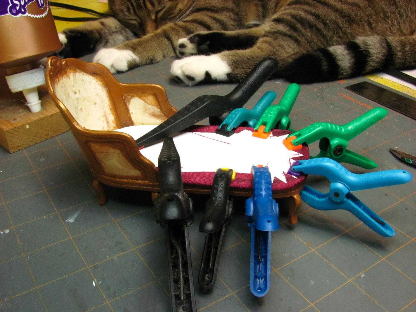 In this picture I have glued, using wood glue, three pieces of mat board together and have it clamped to dry. This is for the legs, I am going to use my scroll saw to cut out the six legs. Six legs are an option, you may want to just use 4. If you scroll down you find a picture showing the unfinished chaise with 4 legs. I like 6 so I am using 6.