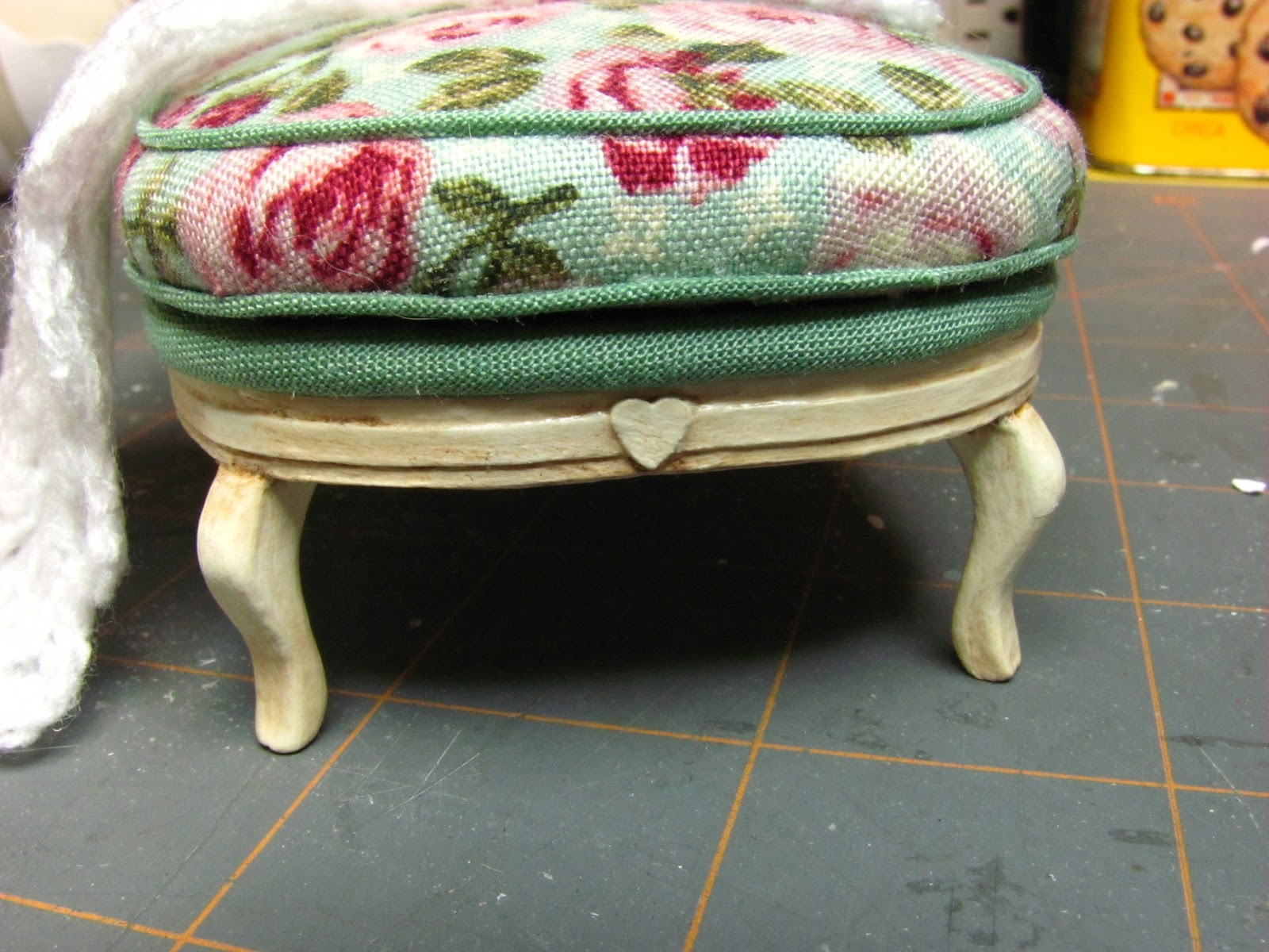 Some of you might be looking around my room and wondering what that is under the window that's covered up with the yellow checkered tablecloth. That's my Passap knitting machine. I used to be quite a machine knitter. I wrote for a magazine for 6 years and authored 2 books. I don't use it much anymore, I love doing miniatures just tooooo much. I mention this because of the little afghan on the shabby chic chaise. I knit the afghans on that knitting machine.