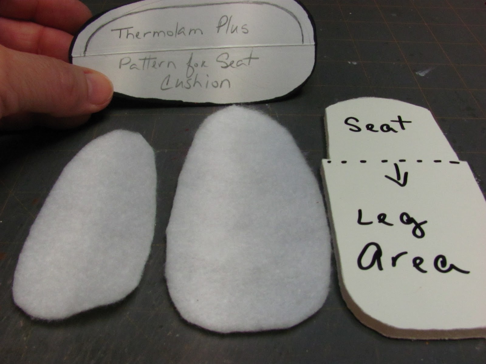 Glue the Thermolam Plus onto the edge of the cushion base, only in the "leg" area, not past the notched area that is the seat. Trim off the extra even with the mat board.
