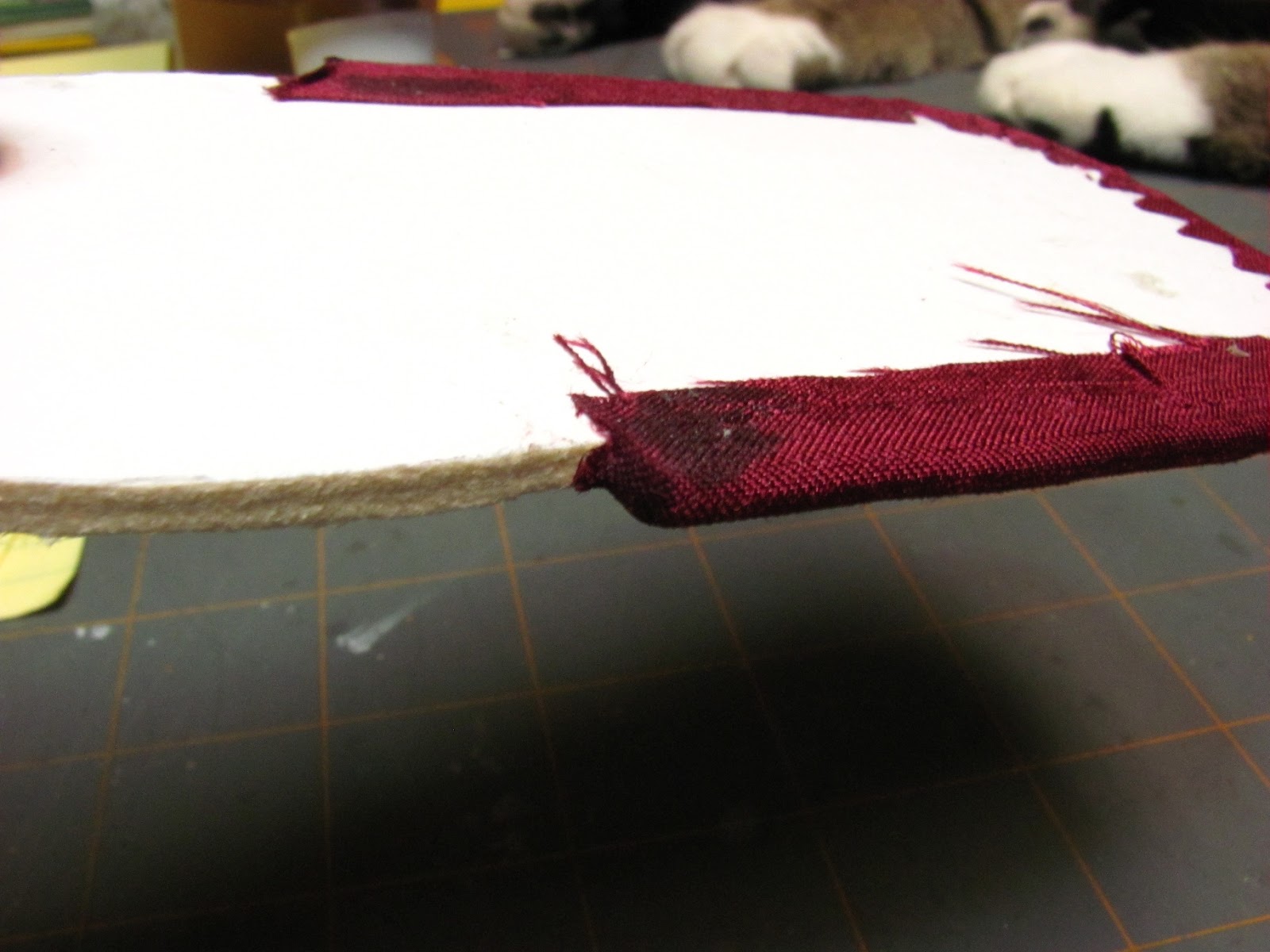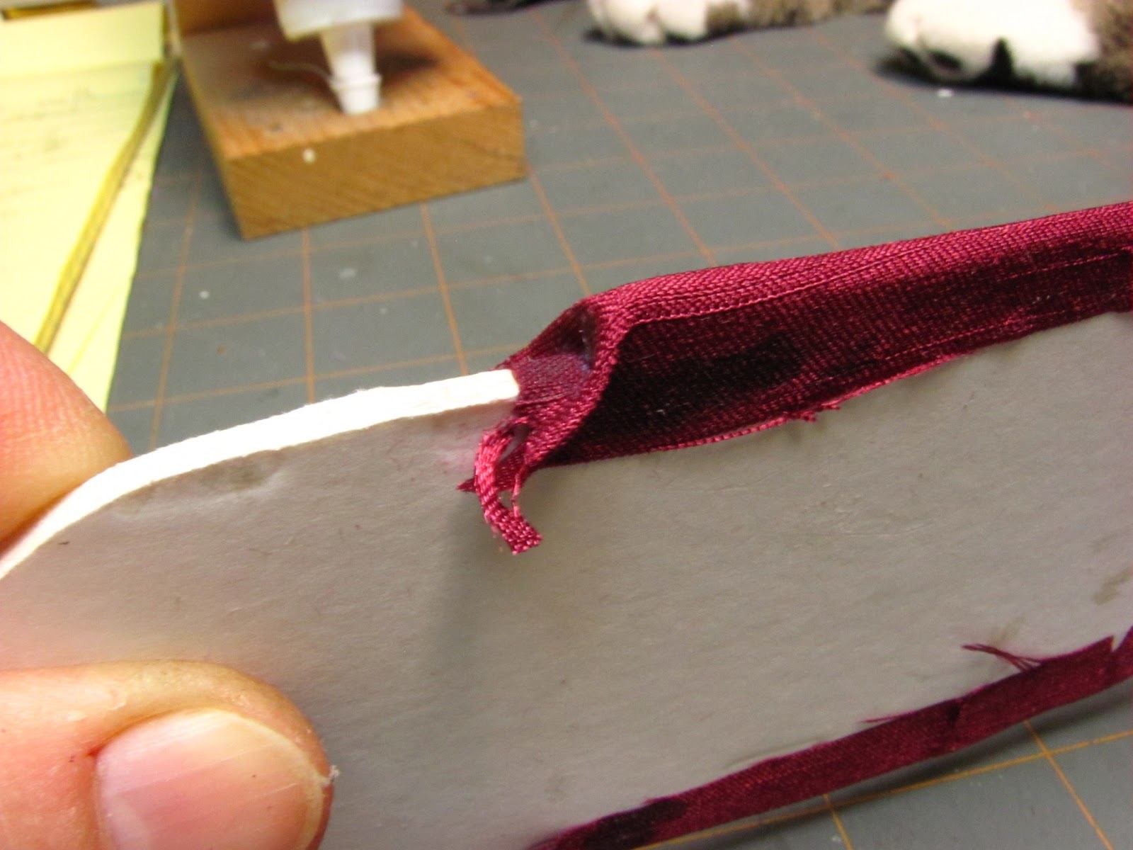 To keep me from pulling the fabric down to the bottom when I begin gluing the bottom, I glued a small bit of the back to the form core.
