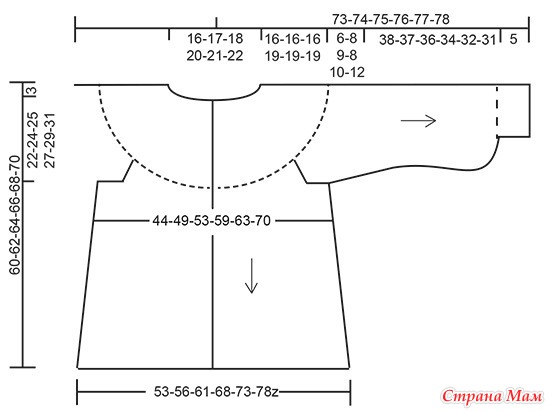Затем вяжите лицевой гладью (петли планок – платочной вязкой), пока высота кокетки в самом коротком месте не составит 22-24-25-27-29-31 см. Разделите вязание на основную часть и рукава: