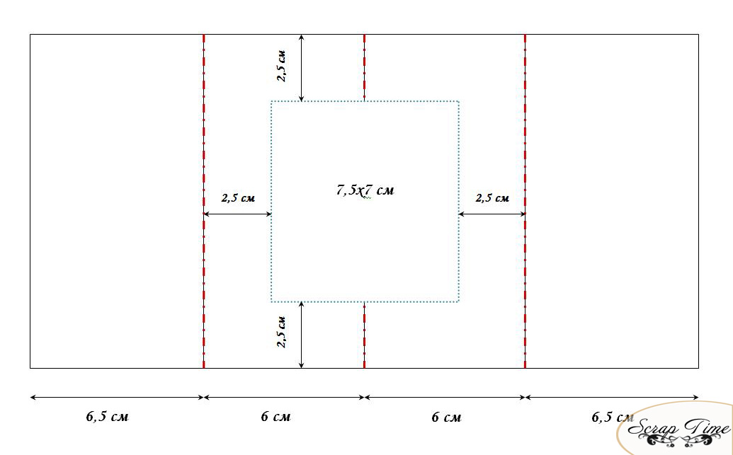 По красным пунктирным линиям складываем, а в середине (синий пунктир) врезаем окошечко. Сгибы я сделала на расстоянии 6,5 см от каждого края, а остававшийся отрезок разделила пополам. Размер самого окошка - 7,5 см в высоту и 7 см в ширину.