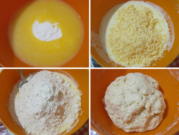 Для теста растопить сливочное масло, остудить и добавить сметану. Затем добавить тертый на мелкой терке сыр, перемешать. Следом всыпать муку с разрыхлителем и замесить тесто.