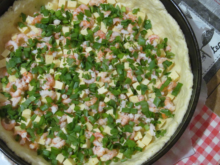 Тесто наколоть вилкой и выложить на него сыр, нарезанный небольшими кубиками. На сыр выложить очищенные вареные креветки и посыпать мелко рубленной зеленью.