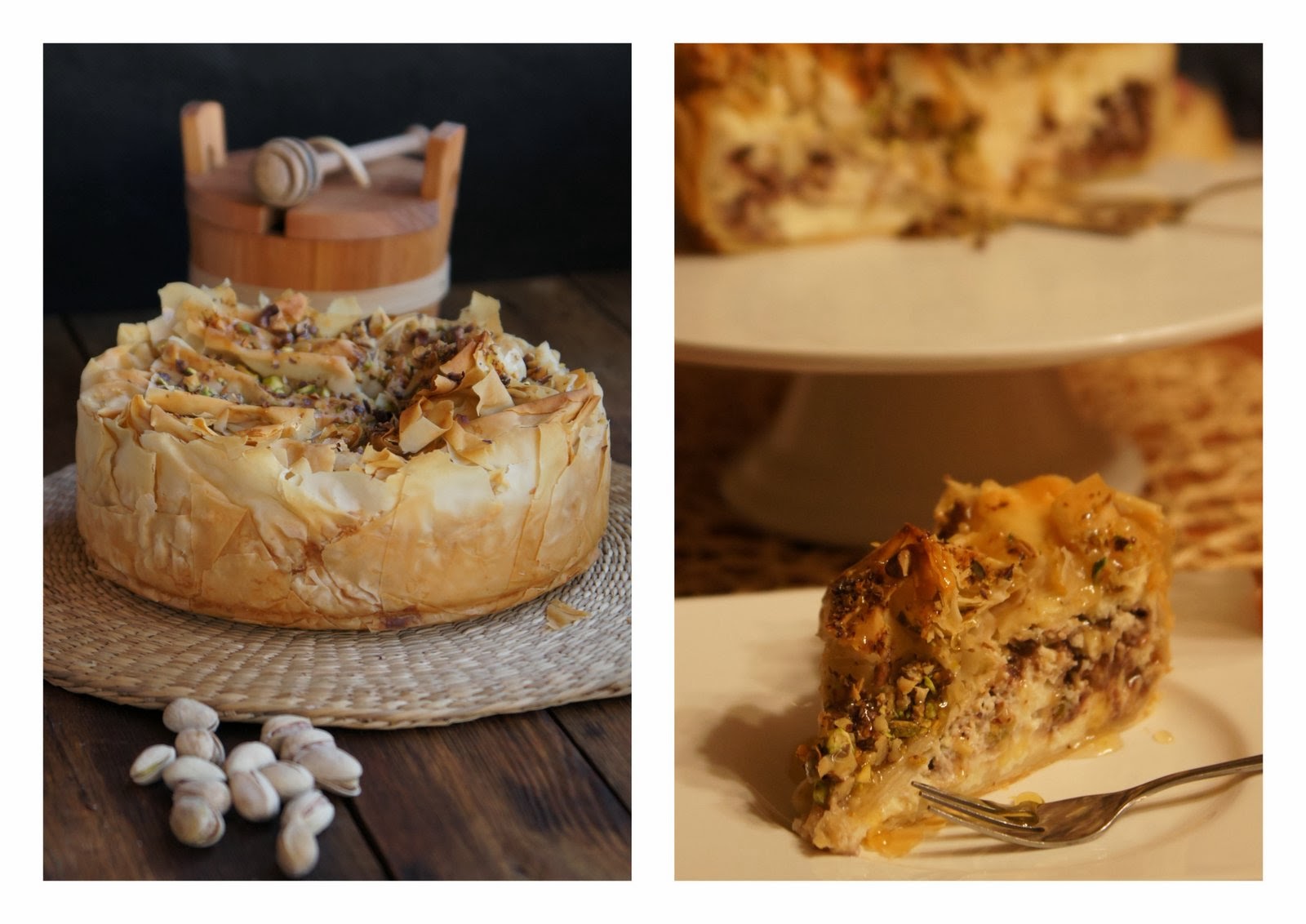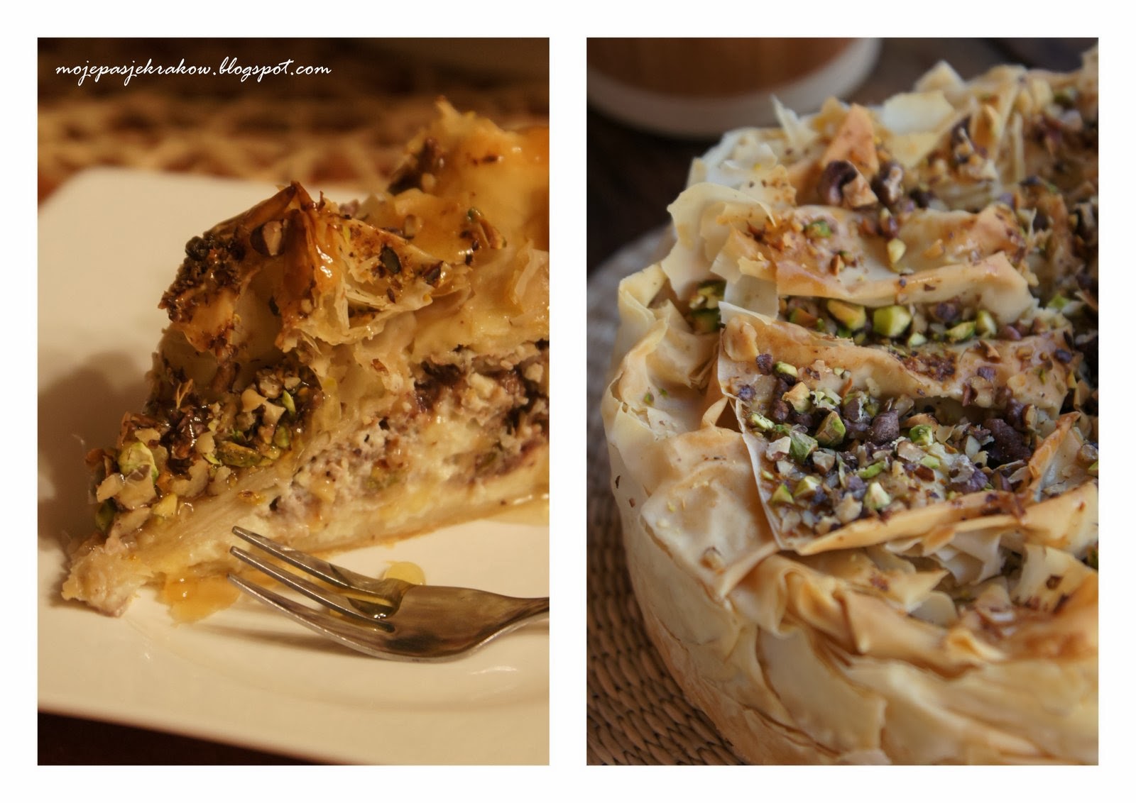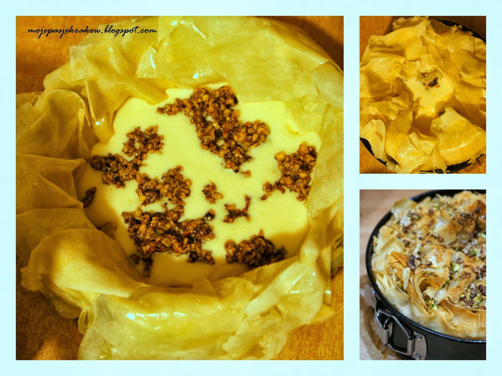 Затем, отложенные два листа Filo смазываем маслом с обеих сторон, и делаем как раньше и выкладываем небрежно сверху. Вылить несколько чайных ложки медового сиропа и посыпать горстью измельченных орехов. Положить при той же температуре и запекать еще 15 минут. Тесто должно красиво подрумянится . Для охлаждения оставить в духовке, а потом на всю ночь в холодильнике.