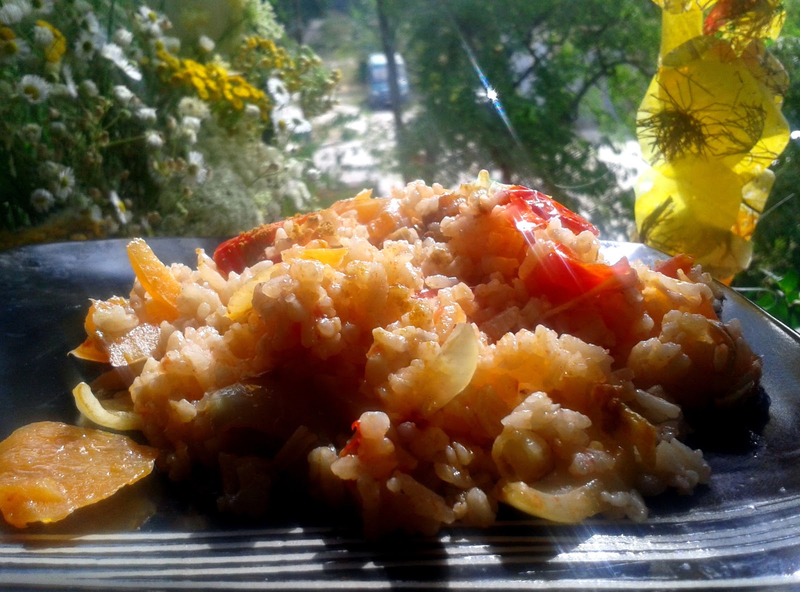 Готовила, впрочем, так: обжарила до прозрачности на растительном масле, долила кипящей воды, дала вскипеть, убавила огонь, дала воде впитаться в рис и оставила париться до готовности.