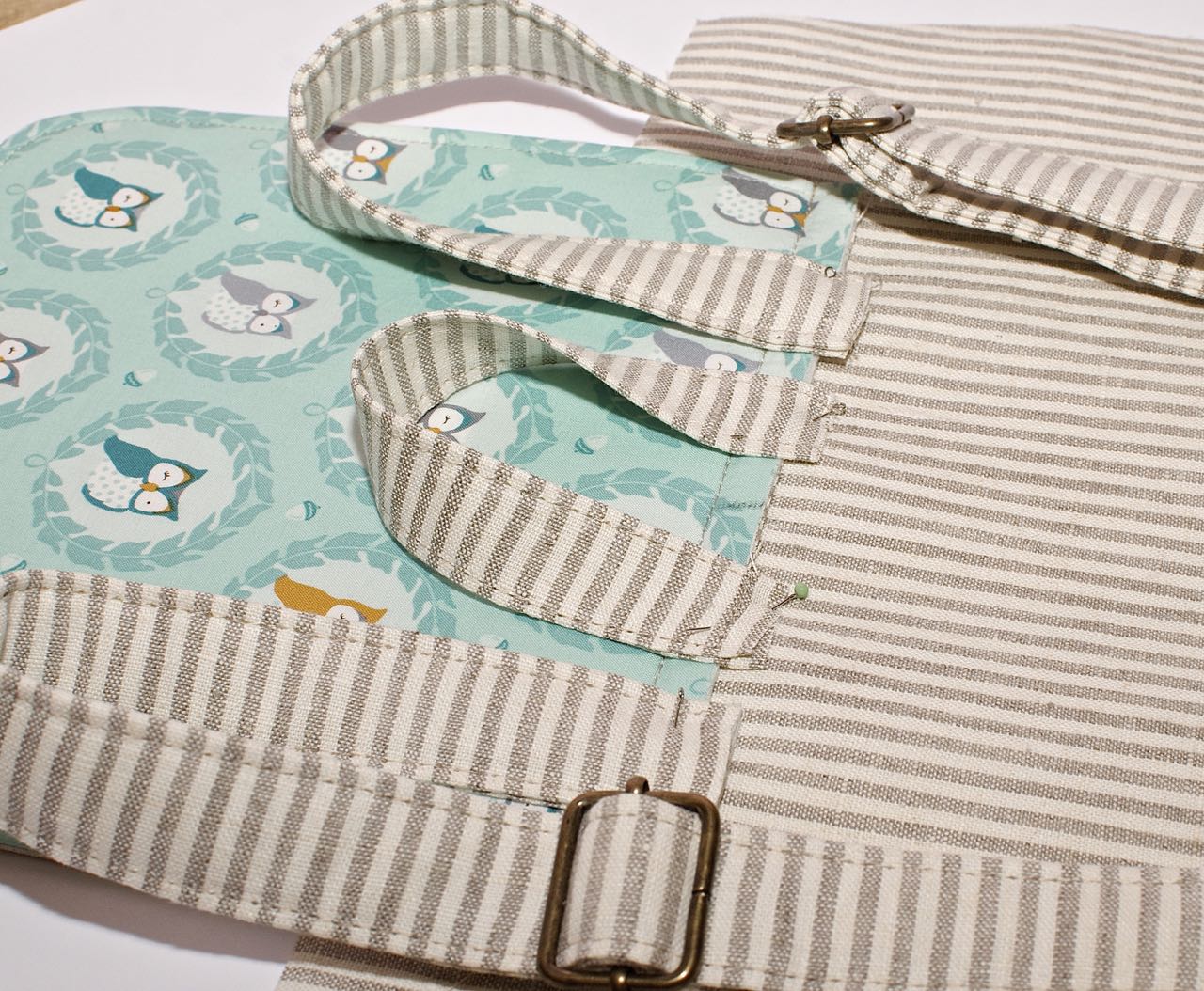 Дальше на расстоянии 1,5 см в обе стороны от центра пристегиваем ручку для переноски, и отступив 1 см от ручки пристегиваем ремешки. Фиксируем размещение швом. Рекомендую несколько раз прострочить это место, можно зигзагом, так как на него будет большая нагрузка.