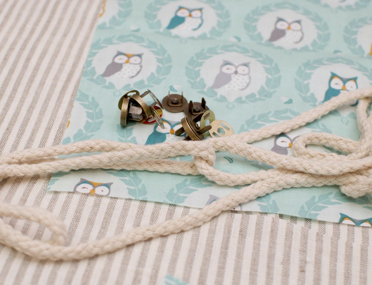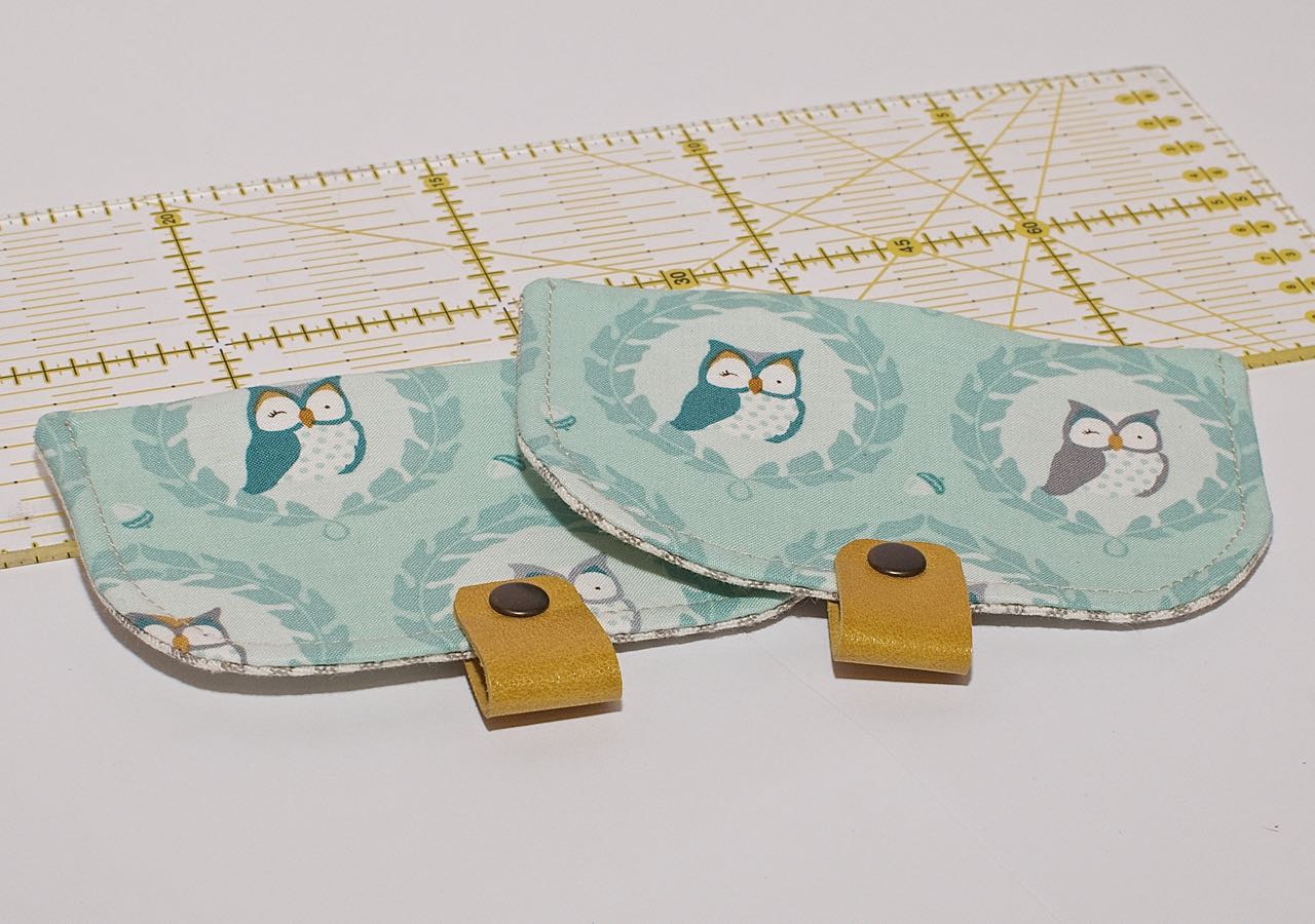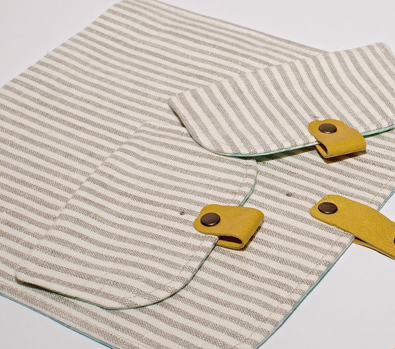 На маленькие клапаны используем полоски размером 6х2см. Складываем в 2 раза и одеваем на клапан. Закрепить их можно хольнитенами или пуговицами.
