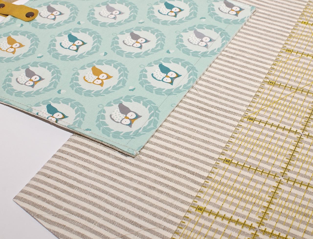 Прикладываем клапан лицевой стороной вверх так, чтоб намеченная линия как раз попадала на линию пришивания клапана. А это 1 см от края клапана