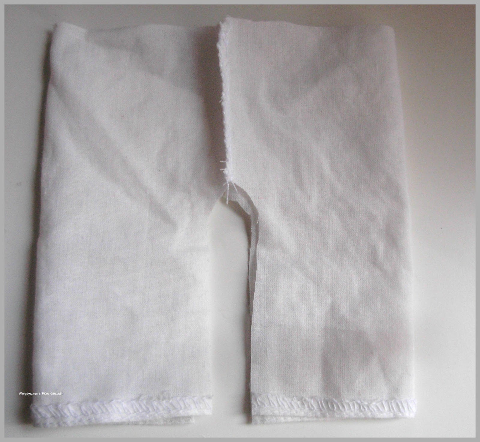 Ну и любимая часть :)) Штанишки пантолошки:)) Наверное почти все их умеют шить:) Но все же покажу как я это делаю:) В зависимости от ширины , длины и вида что это будет .Панталончики по шире или просто штанишки вырезаю всего две детали ,учитывая расстояния между ножек нашей игрушки . Дальше обрабатываем низ ,если нужно широкие без стягивания внизу ,то сразу удобно пришить и кружева .Сшиваем и обрабатываем и две верхние боковые стороны .Вот так должно получиться .