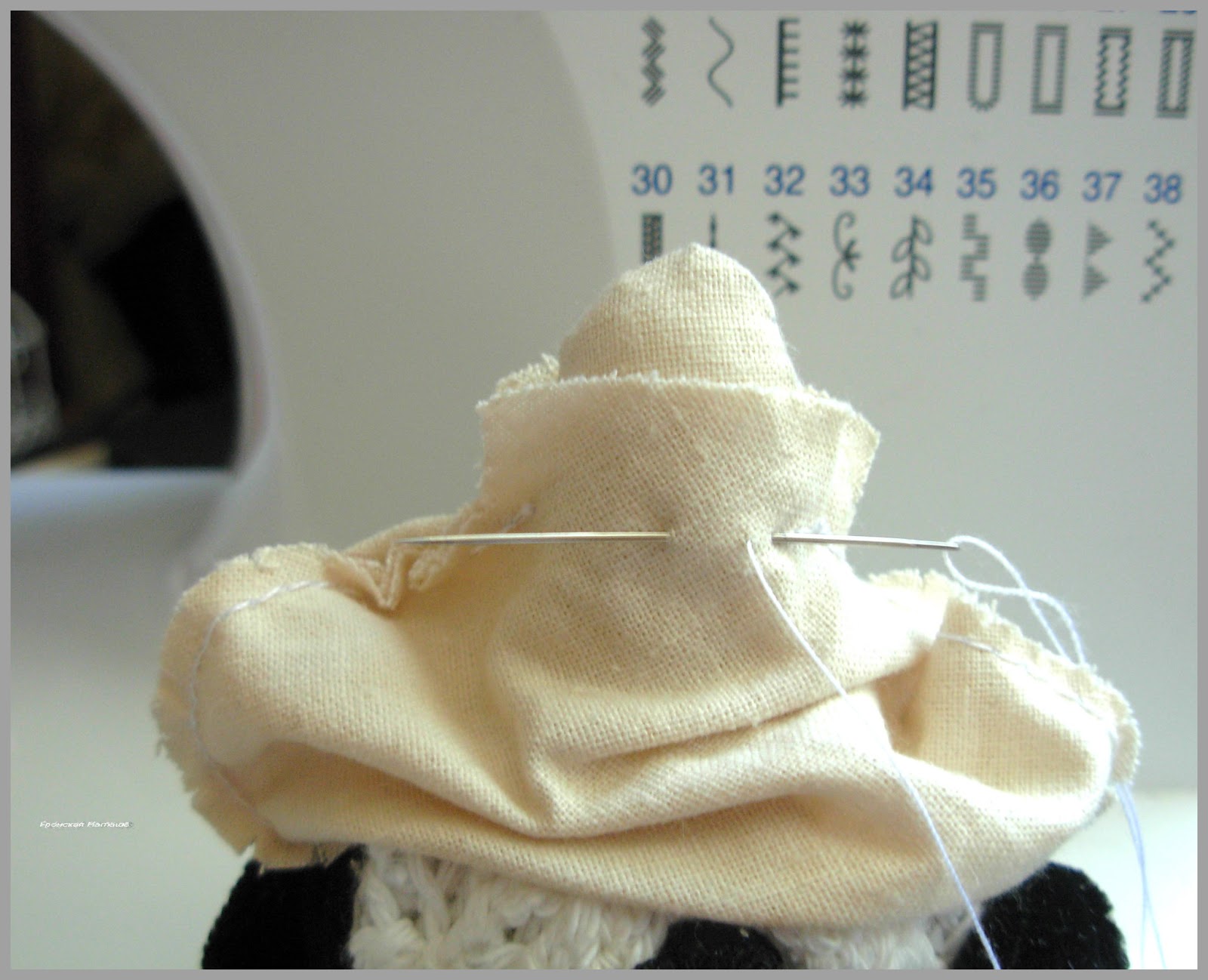 Теперь не выворачивая одеваем вот таким образом нашу головку на шейку ,дырочка для шейки должна быть верхней .Пришиваем обычным стежком назад иголку .