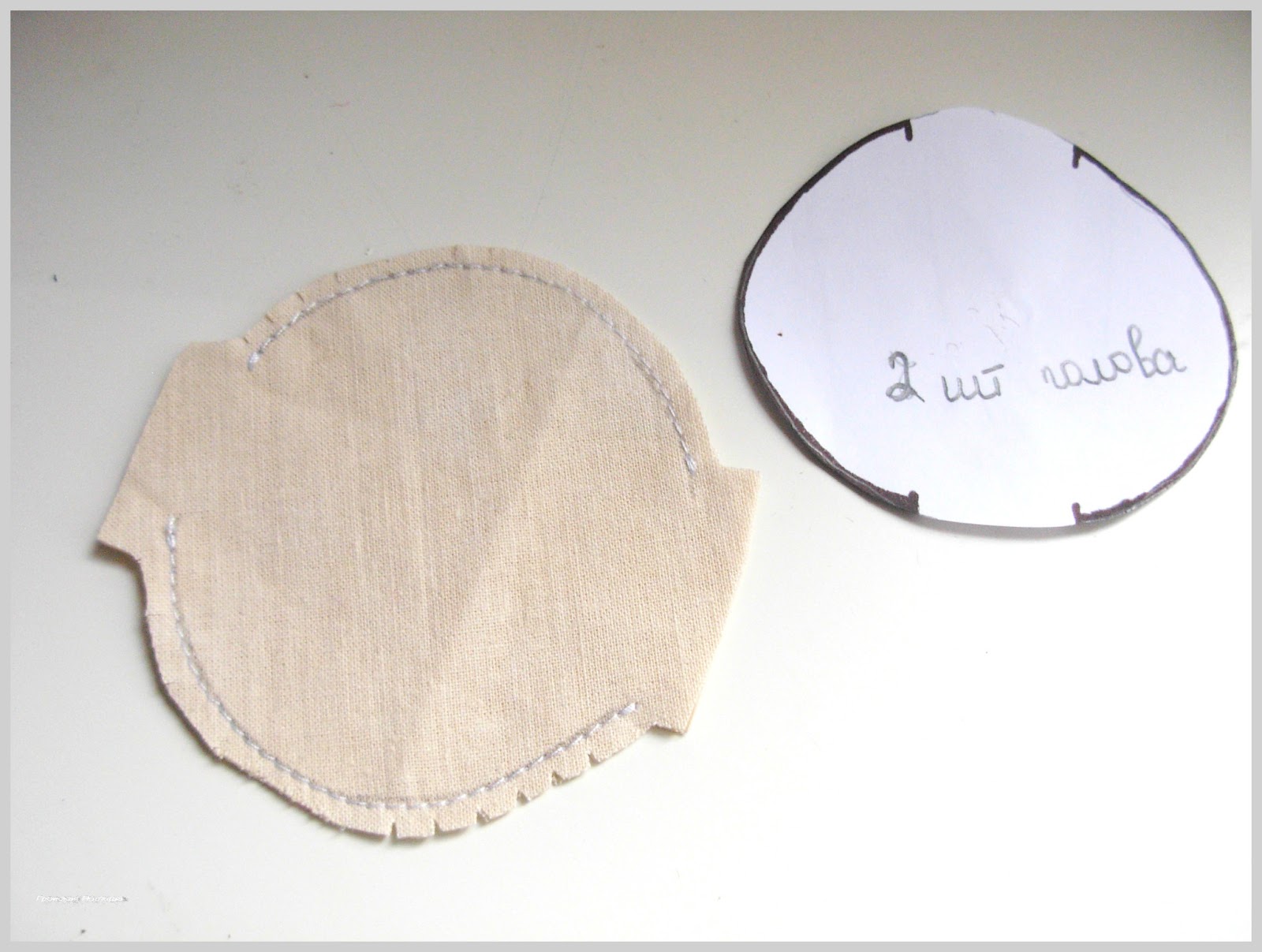 И так головка -рисуем ,прошиваем оставляя две! дырочки ,одна из которых чуть шире нашей шейки . Делаем надсечки по всей окружности кроме дырочек . Вот так должно выйти .