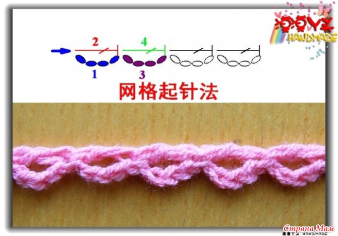 только вместо 4-х ВП - вязала 5, а соединяла СС2Н, работу переворачиваем и получается 1-й ряд связан (и узор рассчитать таким способом легче) . Я делала так:набираете 5вп делаете 2накида и крючок вводите в самую первую вп и провязываете сначала один накид потом второй чтобы на крючке осталось одна петля и снова 5вп 2накида и опять в первую петельку из 5вп.