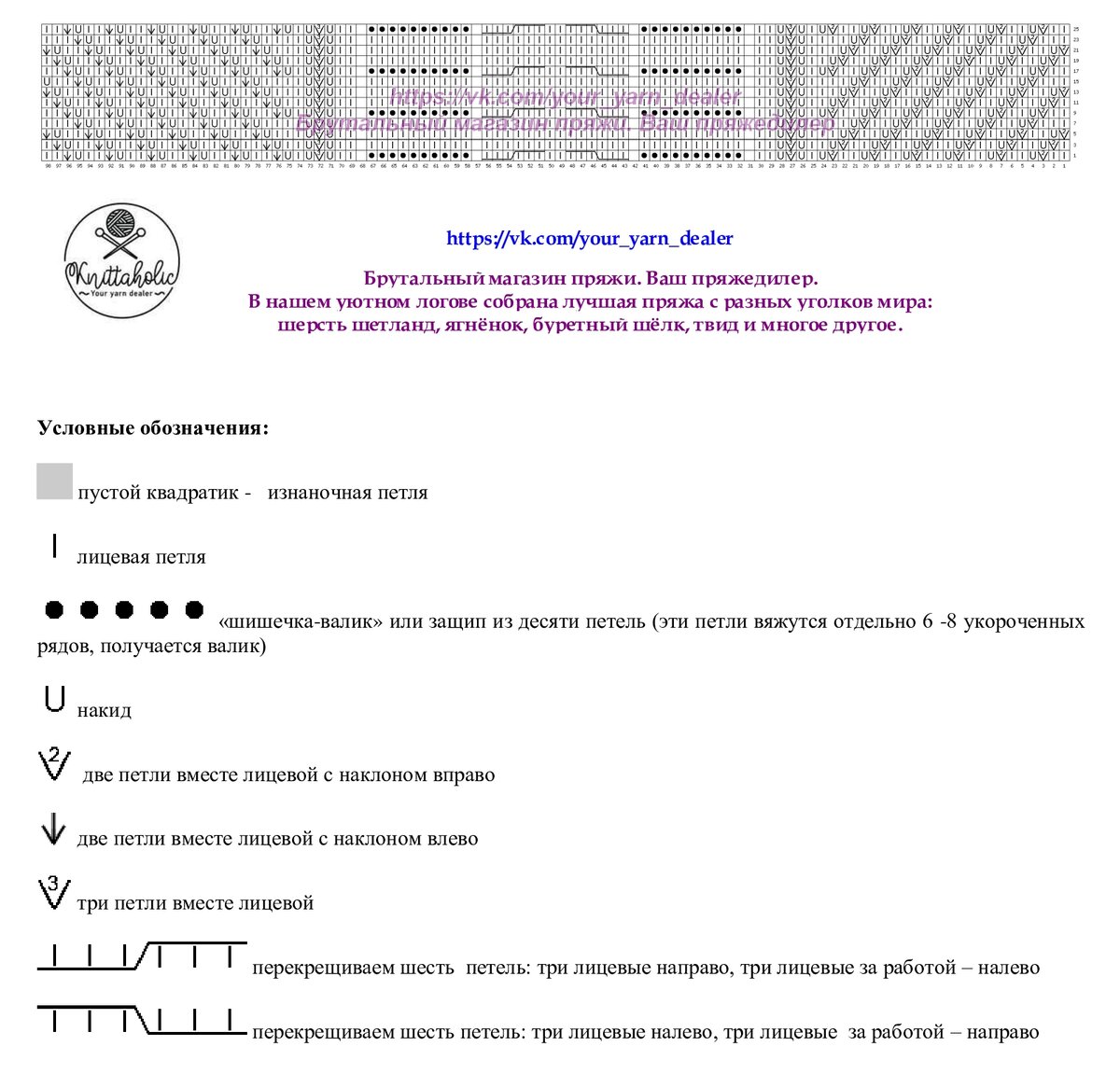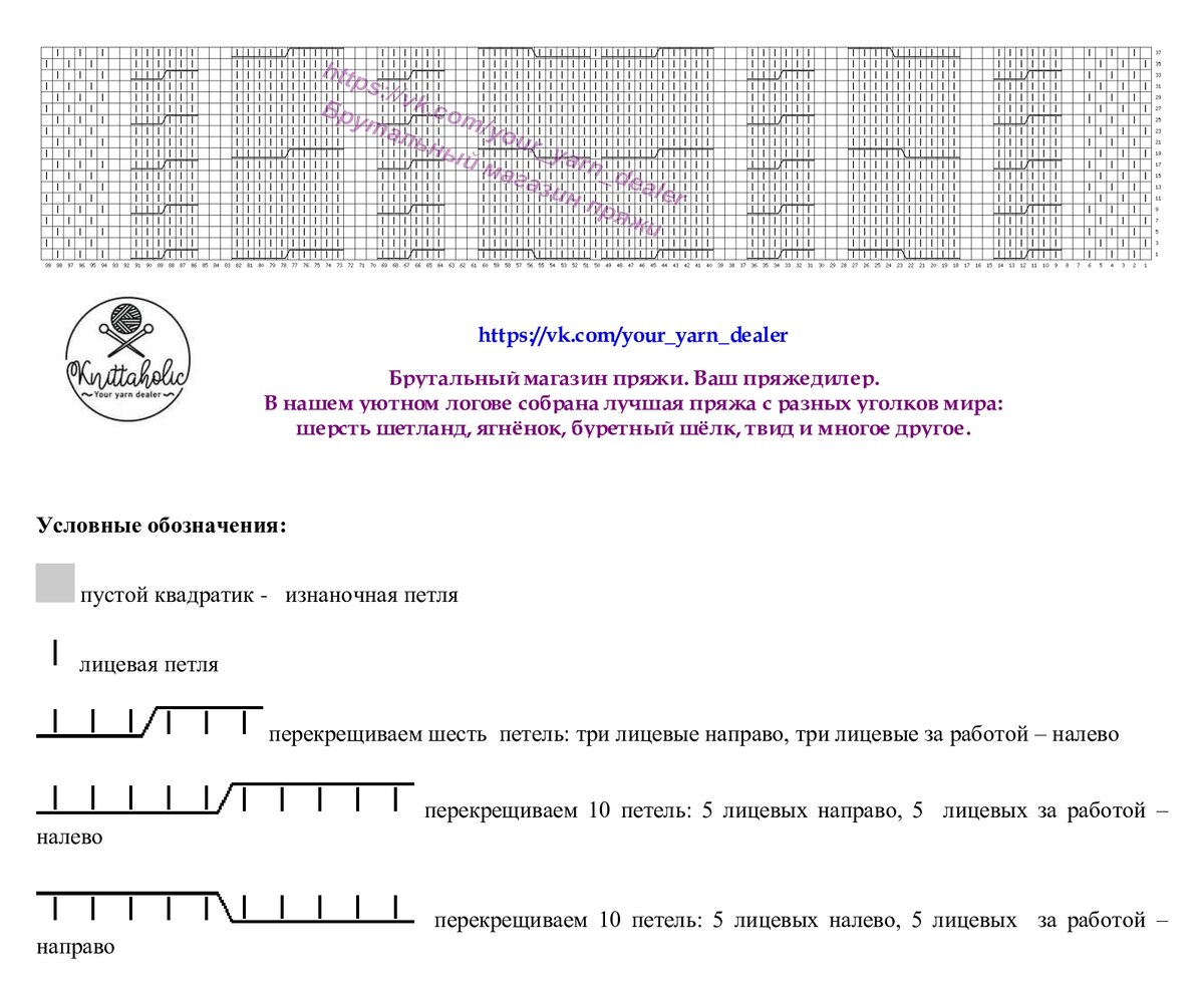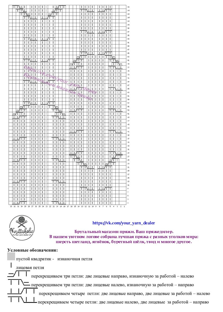 На этой схеме нарисован один раппорт узора из жгутов. В высоту он очень большой - 112 рядов, а в ширину - 32 петли плюс одна изнаночная петля для симметрии.