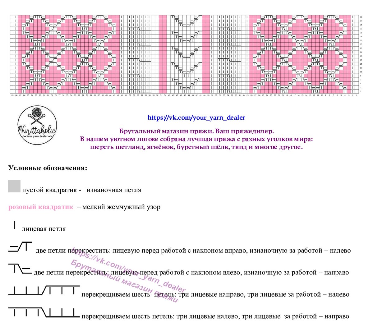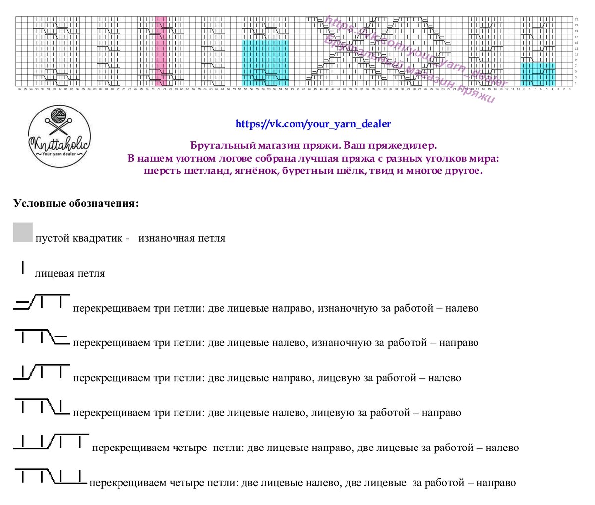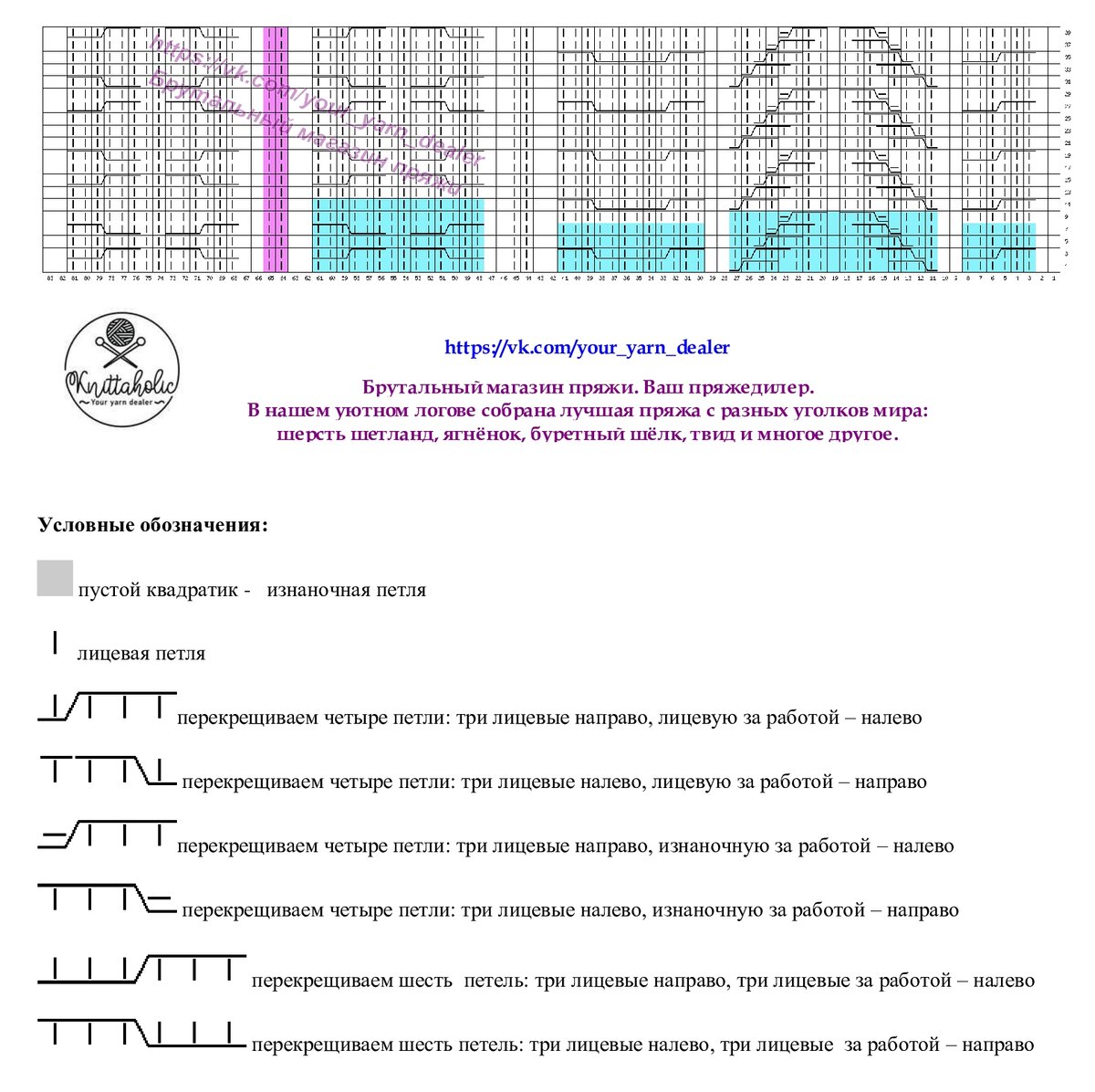 На рисунке - схема вязания переда свитера. Розовым цветом отмечены раппорты всех узоров, которые чередуются.