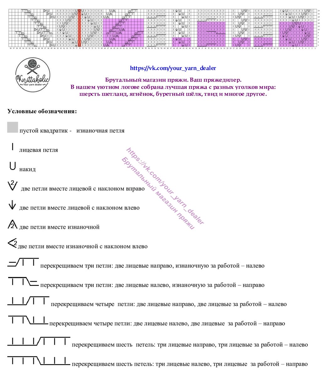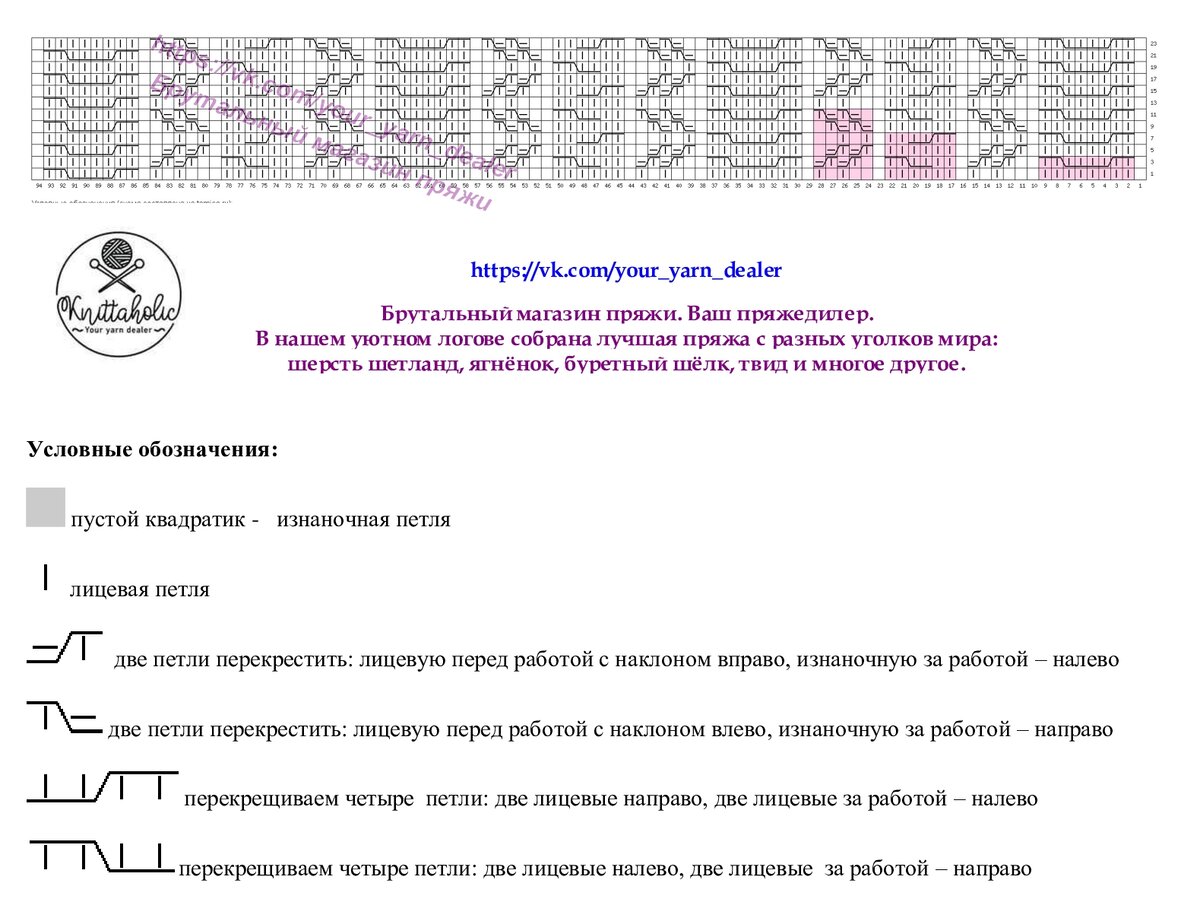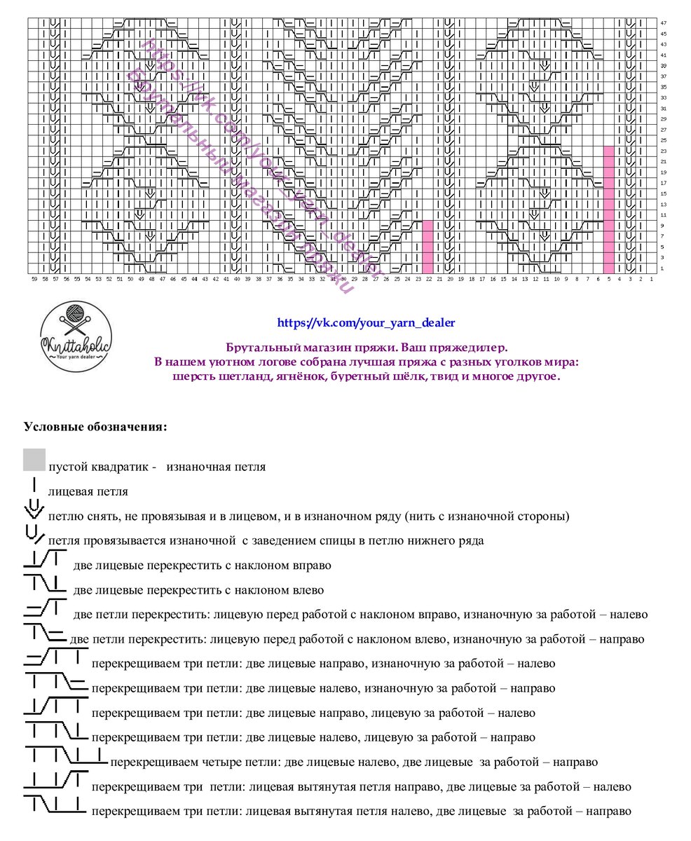 На рисунке - схема вязания переда свитера. Розовым цветом отмечены раппорты всех узоров, которые чередуются.