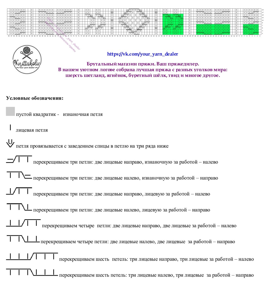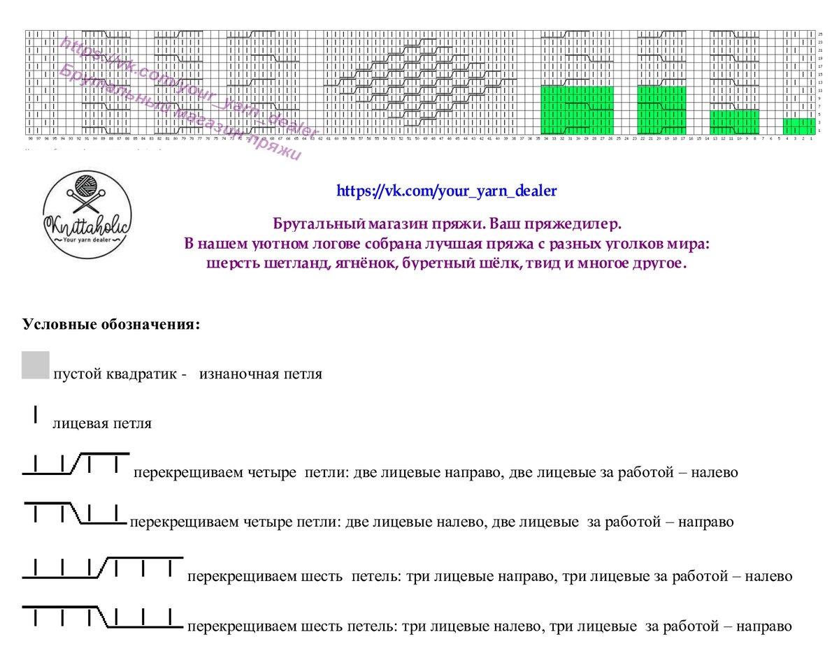 На схеме зеленым цветом отмечены раппорты двух вертикальных узоров (восемь и девять петель).