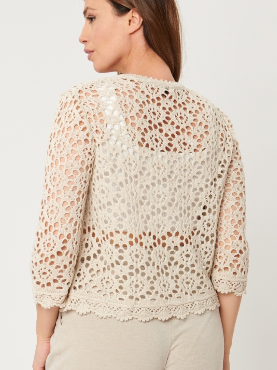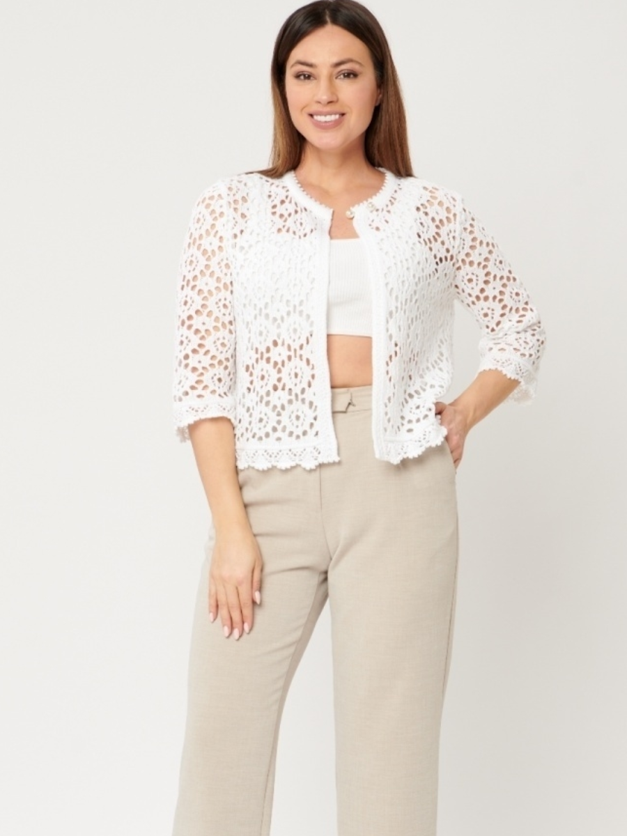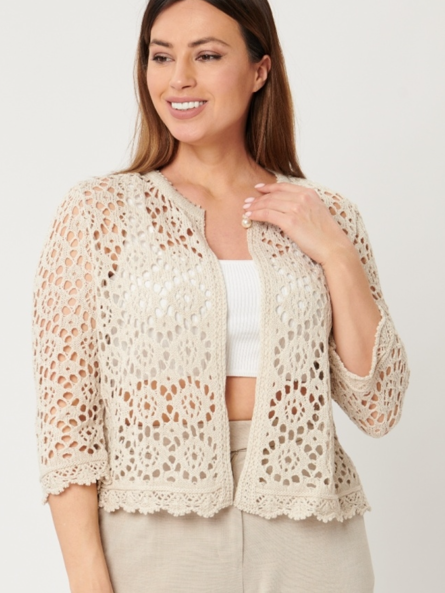 Представляю вашему вниманию вот такой ажурный летний кардиган. Я много раз "проходила мимо" этой модели, потому что была уверена - это связано крючком (а с ним я не дружу). Но потом у меня появились сомнения. Судя по недорогой цене, это машинная вязка. А разве бывает машинная вязка крючком? По-моему, нет. Я решила рассмотреть модель поближе. И выяснила, что это связано спицами. Вот никогда бы не подумала.