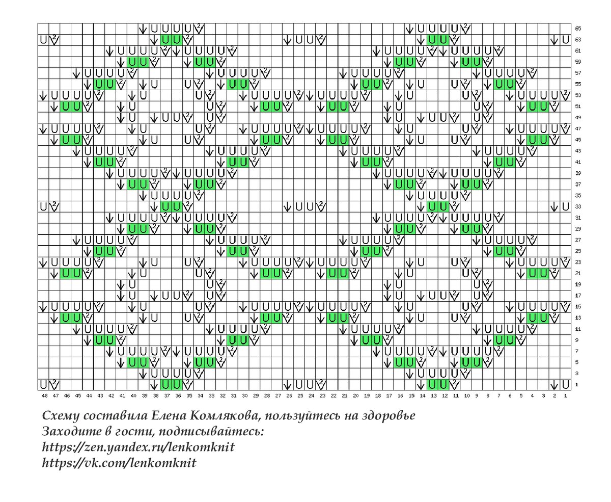 Двойные накиды на схеме, которые отмечены зеленым, в следующем ряду нужно не провязывать, а просто скинуть со спицы.