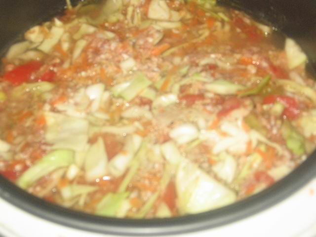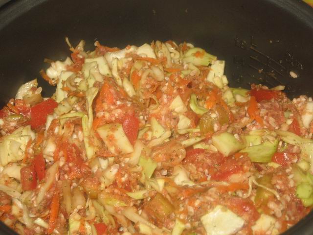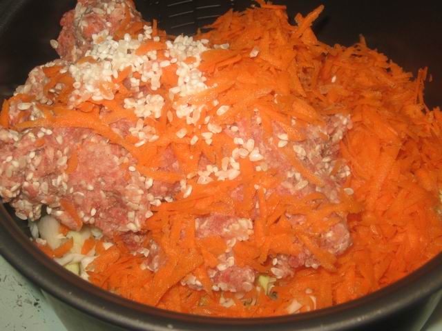 Добавить фарш с рисом и морковь.