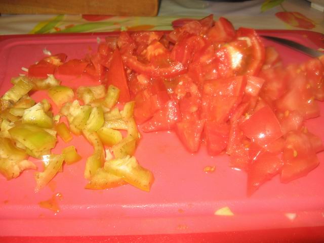 Нарезать помидоры и болгарский перец. Без перца можно прекрасно обойтись.