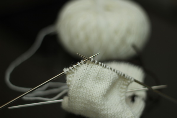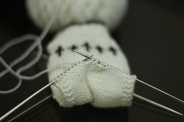 Провязываем 8 петель первой спицы и начинаем поднимать боковые петли из стенки пятки, поднимая по одной петле из каждого рубчика: