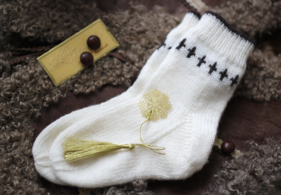 Отдельно несколько слов о дизайне: как обычно, решались исключительно практичные цели. Во-первых, дети в светлых носочках - это очень мило. Во-вторых, у меня большой запас белого «детского каприза», и чтобы как-то отличать парность при стирке, выбран очень простой рисунок и простейшая отделка по верхнему краю.