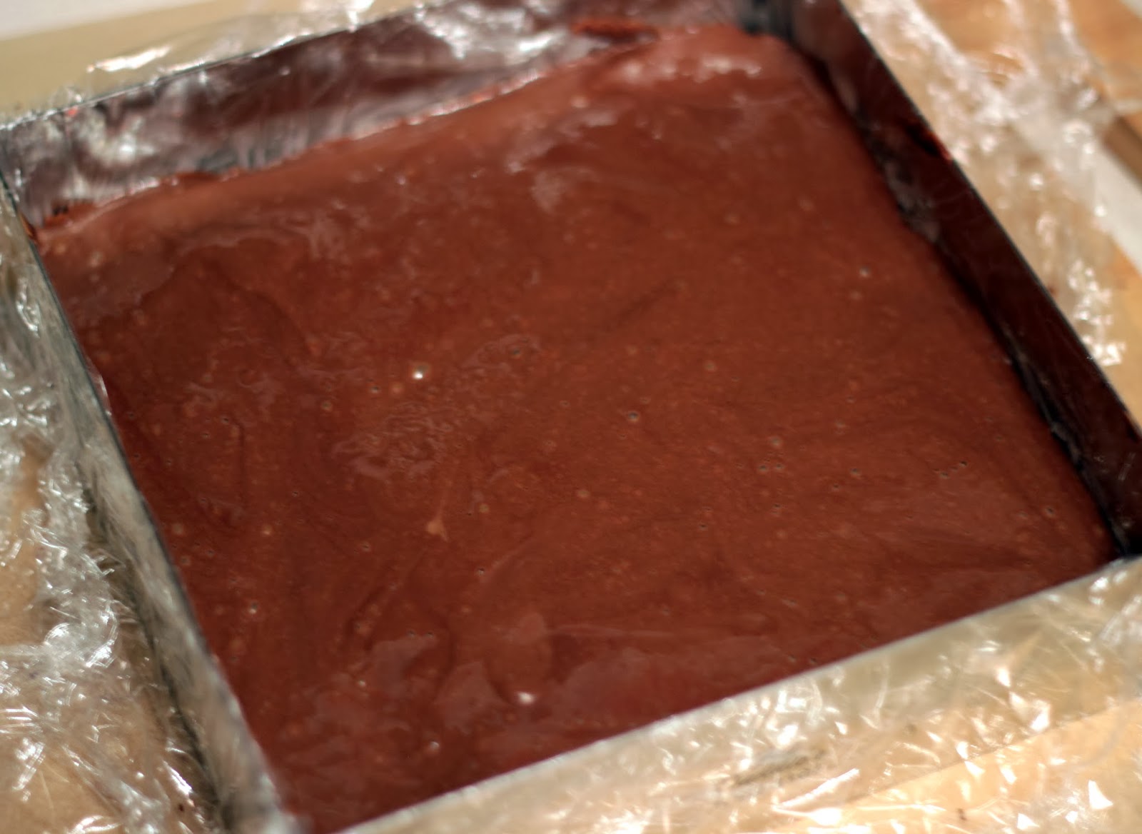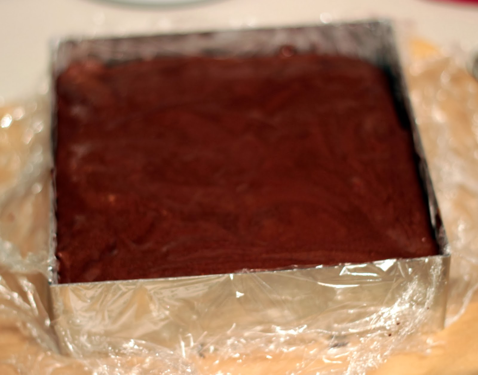 Готовый корж должен казаться недопеченным (так написано в книге, по-моему, чем-то похоже на брауни). Достать его из формы и остудить на решетке. Форму помыть, обсушить и застелить пластиковой пленкой. В идеале - жесткой ацетатной пленкой, которой у меня, к сожалению пока нет, я взяла обычную пищевую пленку. Остывший корж вернуть в форму.