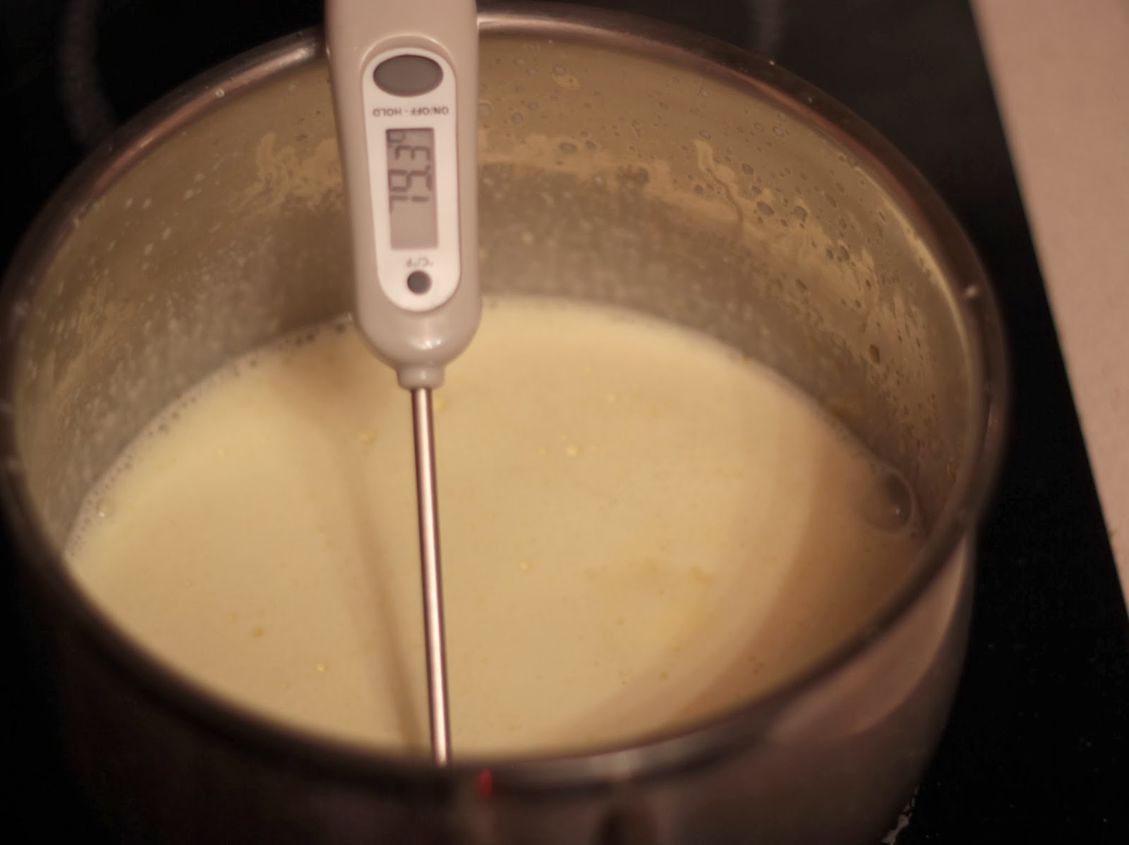 Вернуть смесь желтков с молоком на медленный огонь и, помешивая, довести до температуры 85 градусов. Смесь при этом загустеет. Вылить треть этой смеси в чашу с шоколадом, хорошо перемешать. В два захода вылить остальное, каждый раз тщательно перемешивая.