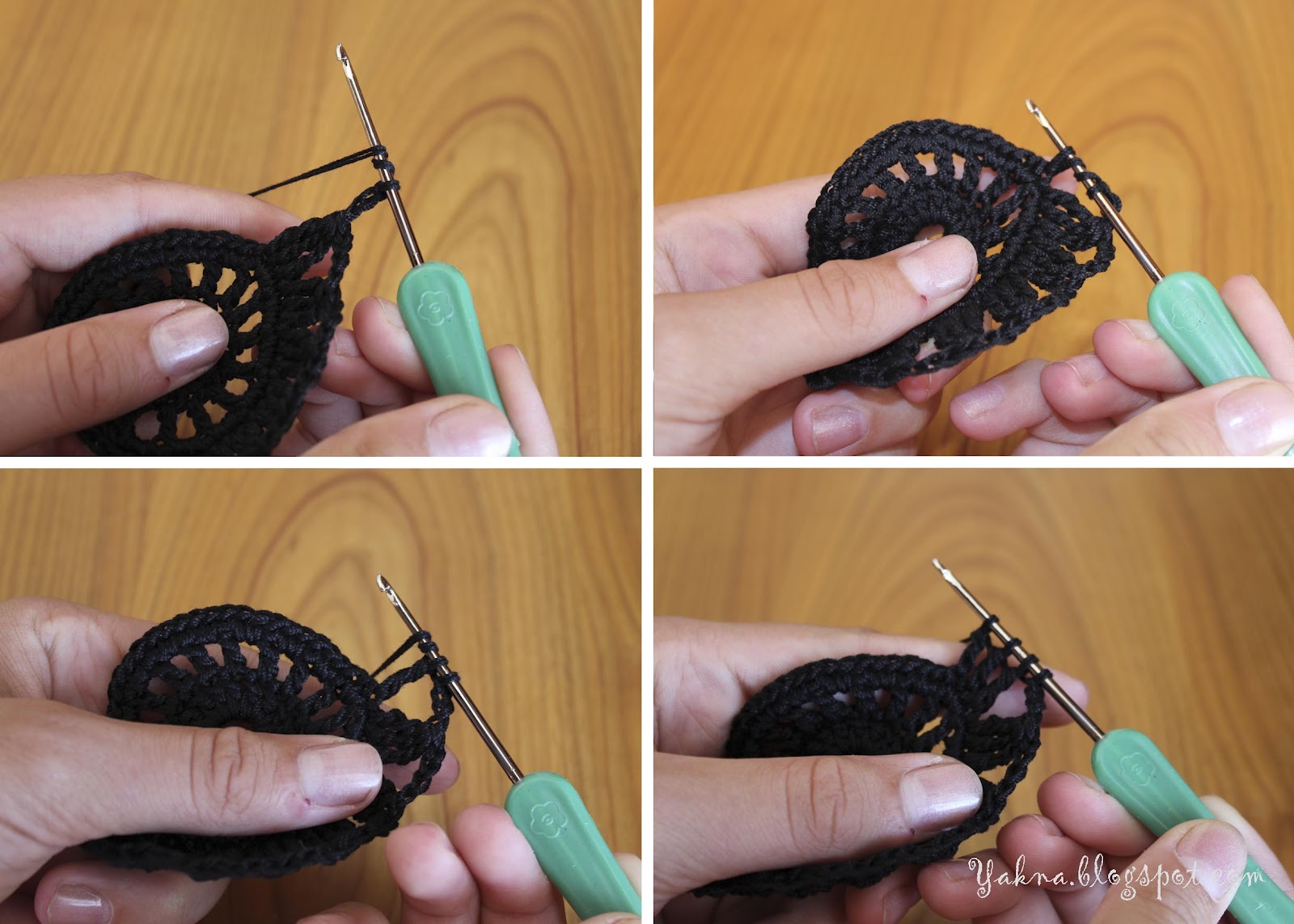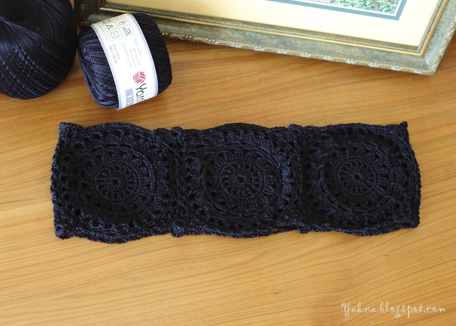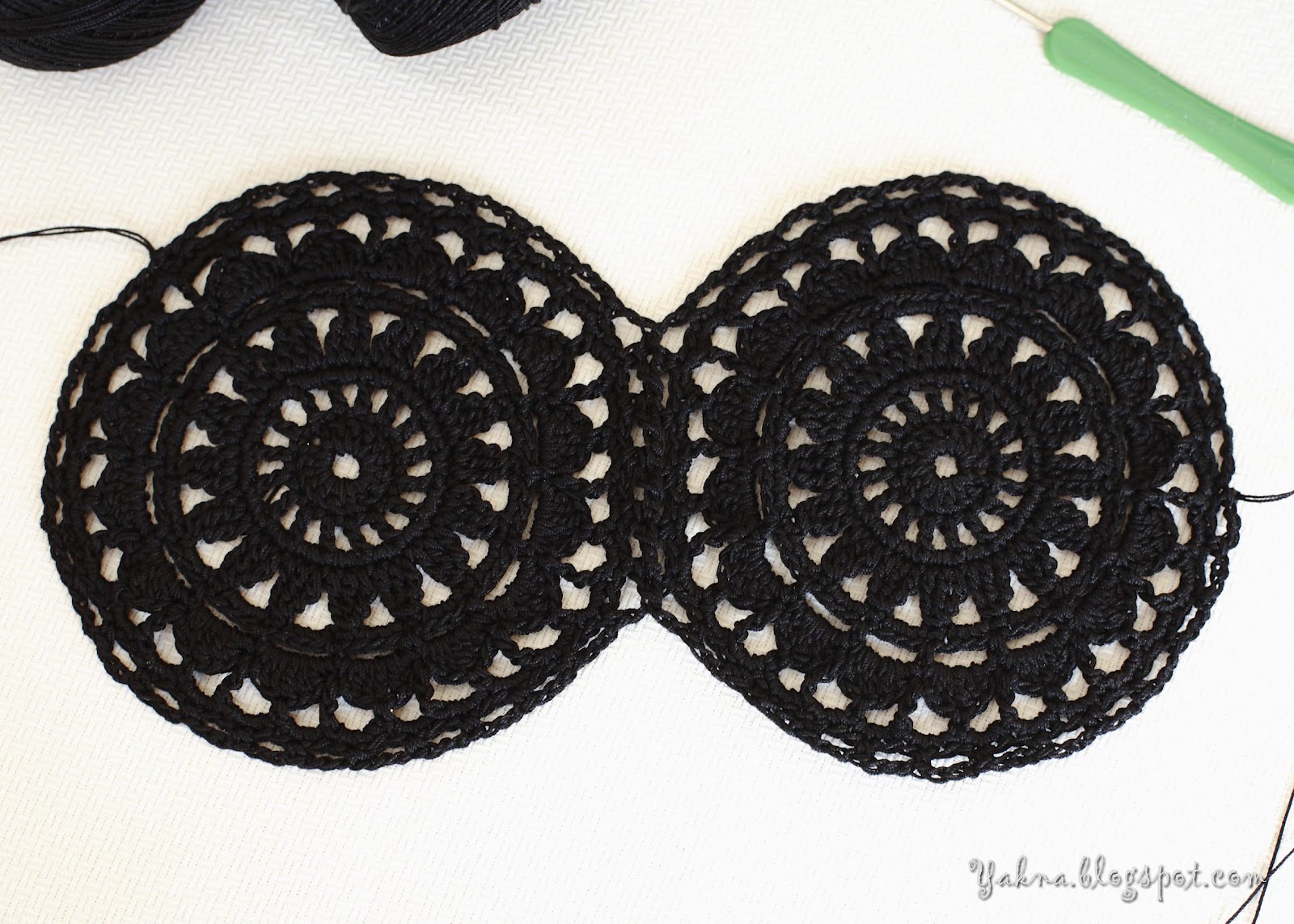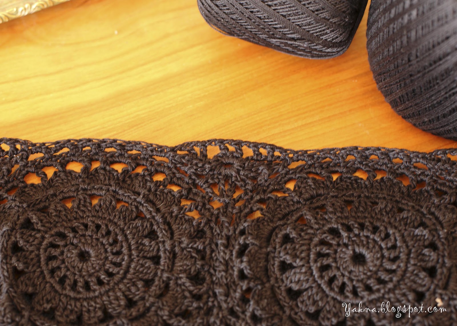 Мы закончили первый круг. Нужно связать таких 6 кругов, при чем довязывая последний ряд каждого следующего круга, соединить его с предыдущим кругом в шести точках, как бы зацепляя его за цепочку последнего ряда.