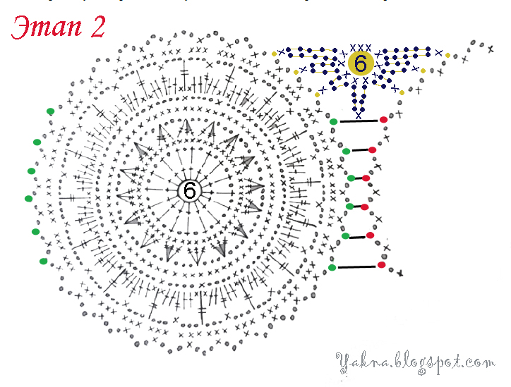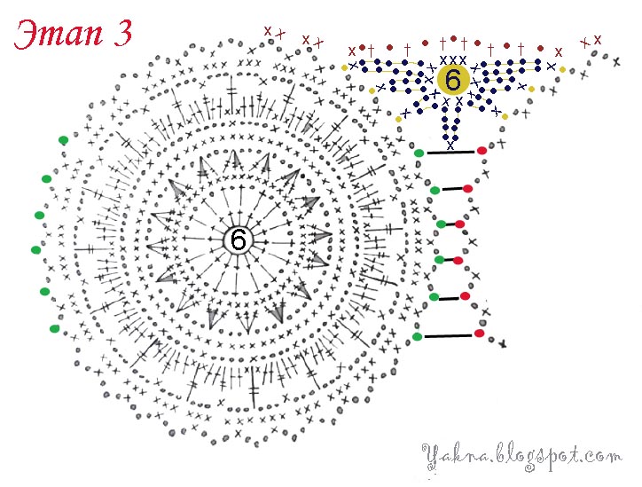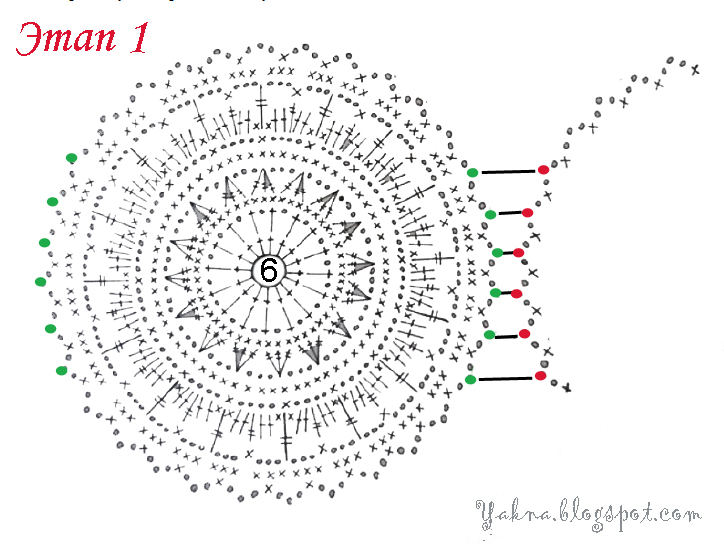 Сегодня предстоит более монотонная работа. Но без нее никуда. Сверху в первом ряду набираем петли следующим образом: в арки из воздушных петель кругов первого этапа по два столбика без накида, 1 столбик без накида в начальную петлю элемента второго этапа, (воздушная петля, столбик с одним накидом) -6 раз, воздушная петл, столбик без накида в конечную петлю элемента второго этапа и т.д. по кругу (смотрите на схеме верхний ряд красным цветом).