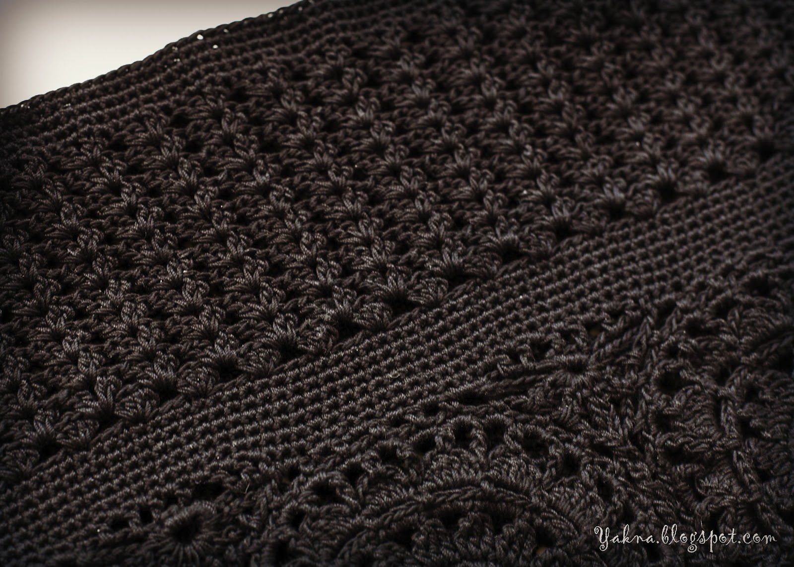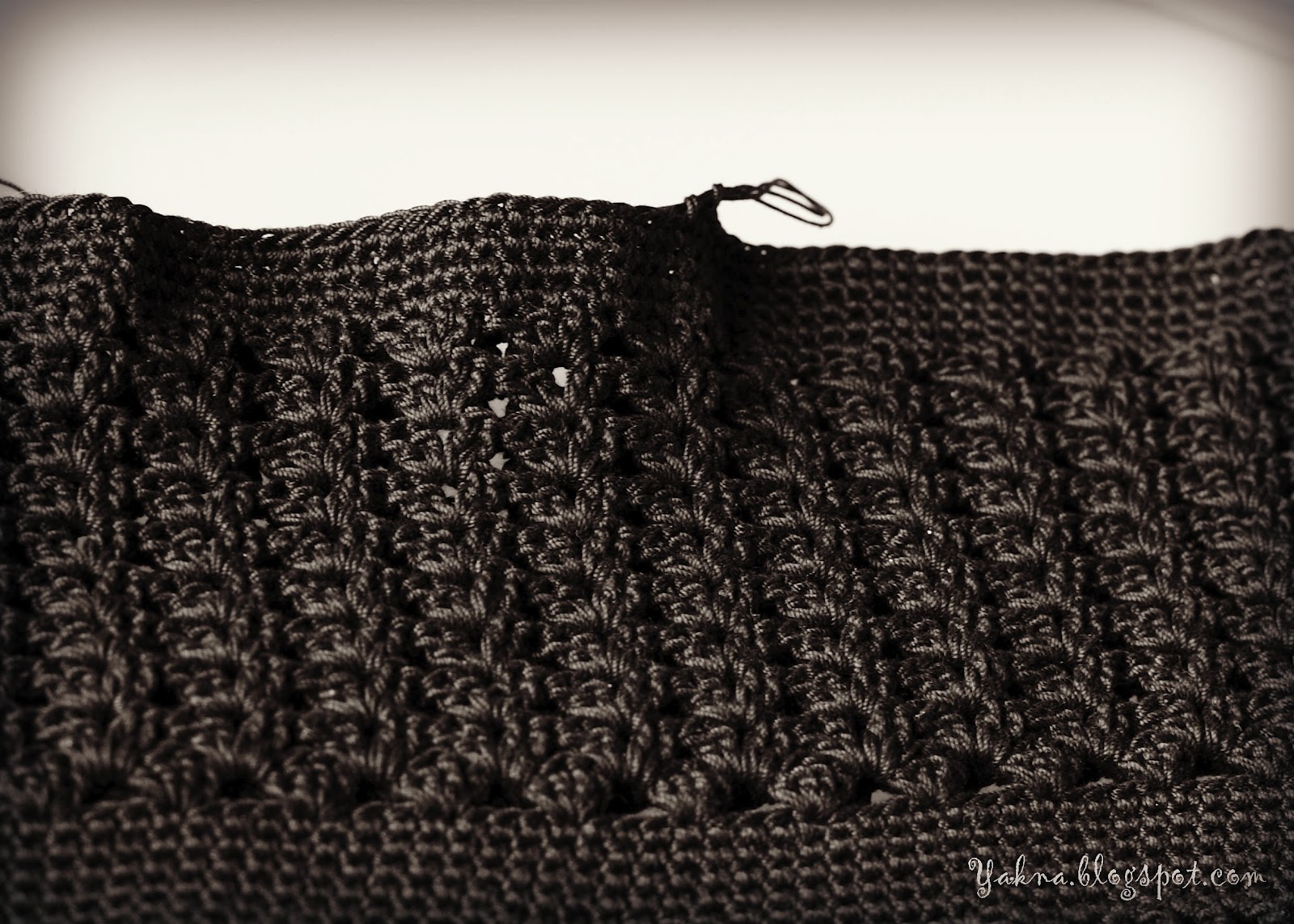 Сегодня выходим на финишную прямую. На предыдущем этапе мы вязали узор из гусиных лапок. Тот, что я на пескерисовала. Изначально я решила, что моя черная сумка будет отличатся от белой. Если белая похожа на майку, то верх черной сумки будет ровным. Поэтому, после 10 рядов узора, вяжем 7-8 рядов столбиками без накида. Те же 7-8 рядов необходимо связать внизу сумки (под ажурными кругами).