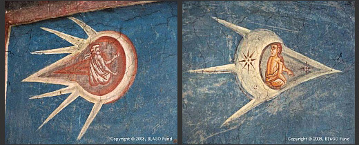 В самом деле на фресках легко можно рассмотреть два «спутника», причём оба летят друг за другом — с запада на восток! В первом сидит человек, не ангел, у него нет нимба над головой. Одной рукой он держится за невидимый «рычаг управления» и оглядывается назад. Создаётся впечатление, что первый «космонавт» следит за полётом следующего за ним товарища, тоже не ангела, рука которого тоже лежит на «системе управления».