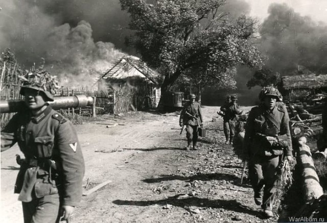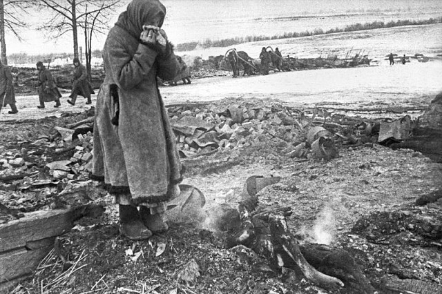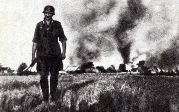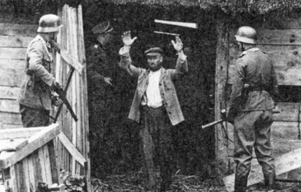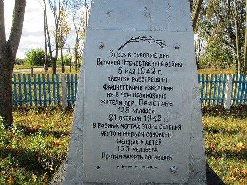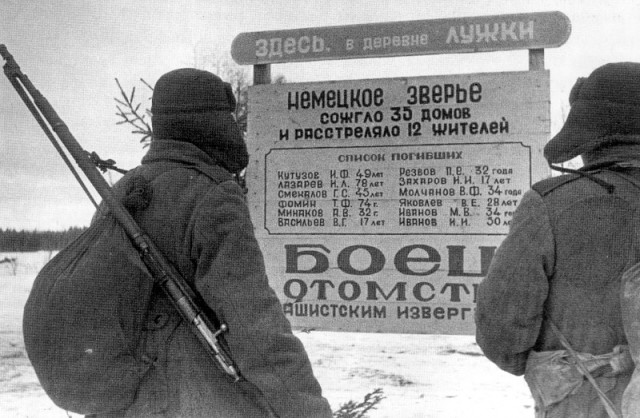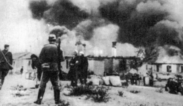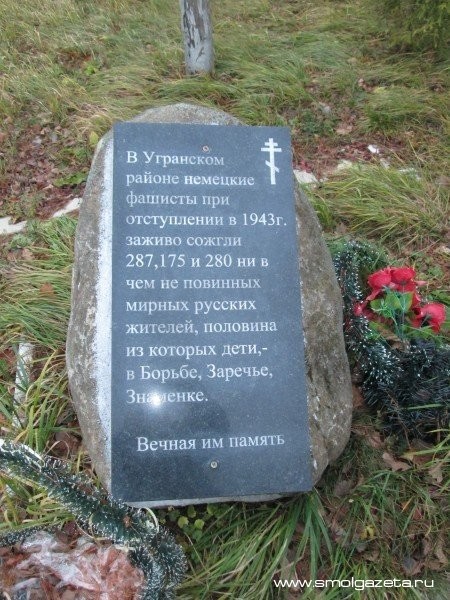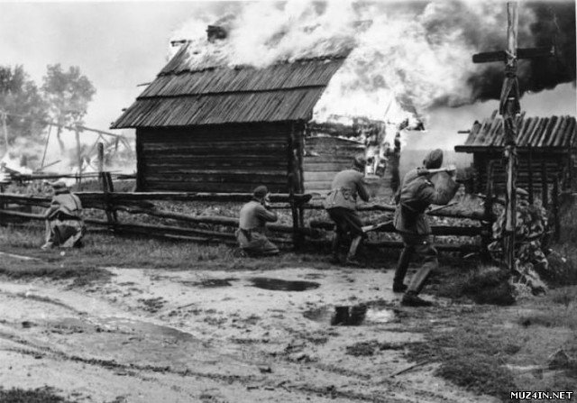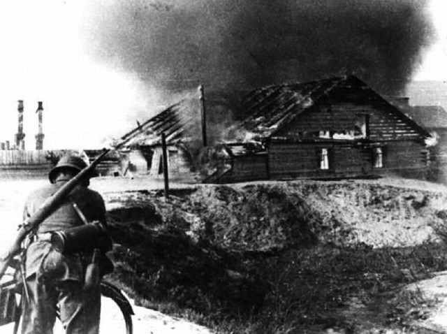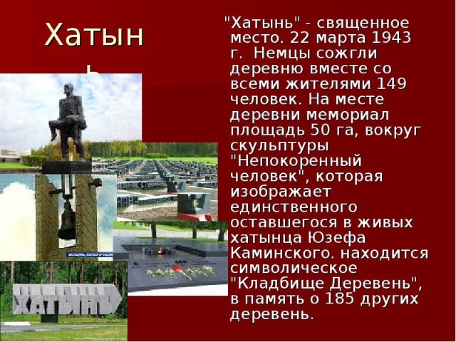 Из протокола допроса Иосифа Каминского (единственный выживший взрослый - 56-летний кузнец) о сожжении деревни Хатынь Логойского района. 31 января 1961 года:... в понедельник, 22 марта, я, находясь дома в дер. Хатынь, услышал стрельбу около деревни Козыри, расположенной в 4 — 5 км. Не помню точно, кажется, в 15 часов партизаны возвратились в Хатынь... Спустя час–полтора нашу деревню стали окружать немцы, после чего между ними и партизанами завязался бой. Несколько партизан в дер. Хатынь было убито, в частности, я лично видел, что в моем огороде лежал труп убитой женщины–партизанки... Партизаны после часового примерно боя отступили, а солдаты немецких войск стали собирать подводы и грузить на них имущество... Остальных жителей начали сгонять в сарай, расположенный в метрах 35 — 50 от моего дома, то есть мой сарай... Ко мне в дом сначала зашло 6 карателей, разговаривавших на украинском и русском языках... Все они были вооружены винтовками. Дома тогда были я, моя жена Аделия и четверо детей в возрасте от 12 до 18 лет. Я стал на колени, они у меня спросили, сколько было партизан. Когда я ответил, что было у меня шесть человек, а кто они такие не знаю, вернее, или партизаны, или другие — я так выразился, спросили затем, есть ли лошадь, и предложили ее запрячь. Как только я вышел из дома, один из карателей, одетый в шинель серого цвета, у него на рукаве были нашиты знаки с каким–то, если не ошибаюсь, коричневым оттенком, высокого он роста, плотного телосложения, полный в лице, разговаривал грубым голосом, ударил меня прикладом винтовки в плечо, назвал бандитом и сказал быстрее запрягать лошадь. Лошадь стояла у моего брата Каминского Ивана Иосифовича, который проживал напротив моего дома через улицу. Зайдя туда во двор, я увидел, что мой брат Иван уже лежал на пороге своего дома убитый. Видимо, он был убит еще во время боя, в результате которого даже окна частично повылетали, в том числе в моем доме. Лошадь я запряг, и ее взяли каратели, а меня и сына моего брата Владислава два карателя погнали в мой сарай. Когда я пришел в сарай, то там уже были человек 10 граждан, в том числе моя семья. Я еще спросил, почему они неодетые, на что моя жена Аделия и дочь Ядвига ответили, что их каратели раздели. Людей продолжали сгонять в этот сарай, и он через непродолжительное время был совершенно заполнен, что даже нельзя поднять рук. В сарай согнали человек сто семь моих односельчан. Когда открывали и загоняли людей, было видно, что многие дома уже горели. Я понял, что нас будут расстреливать, и сказал находившимся вместе со мной в сарае жителям: «Молитесь богу, потому, что здесь умрут все». В сарай были согнаны мирные жители, среди них много малолетних и даже грудного возраста детей, а остальные — в основном женщины, старики. Обреченные на смерть люди, в том числе я и члены моей семьи, сильно плакали, кричали. Открыв двери сарая, каратели стали расстреливать из пулеметов, автоматов и другого оружия граждан, но стрельбы почти не было слышно из–за сильного крика (воя) людей. Я со своим 15–летним сыном Адамом оказался около стены, убитые граждане падали на меня, еще живые люди метались в общей толпе, словно волны, лилась кровь из раненых и убитых. Обвалилась горевшая крыша, страшный, дикий вой людей еще усилился. Под ней горевшие живьем люди так вопили и ворочались, что эта крыша прямо–таки кружилась. Мн