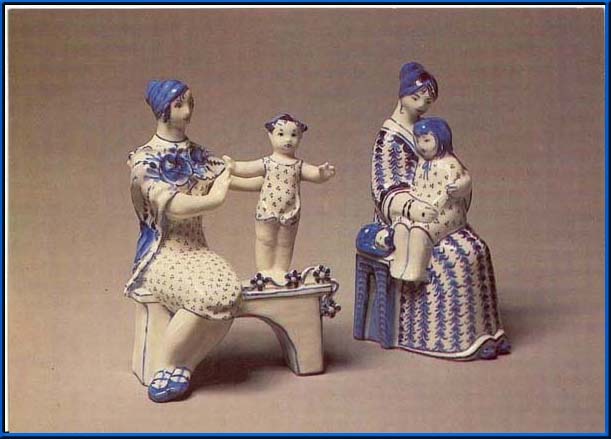 В 1954 г. в артель «Художественная керамика» пришла молодая художница Л.П.Азарова. На нового специалиста возлагались большие надежды. Одними из первых работ для Гжели были скульптуры «Царевна-лягушка», «Иван-царевич», «Телятница», «Девочка с курами» и другие, в которых преобладали в основном иллюстративность и повествовательность.