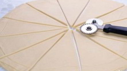 Полученное тесто разрежьте острым ножом для пиццы на двенадцать равных по величине треугольников.