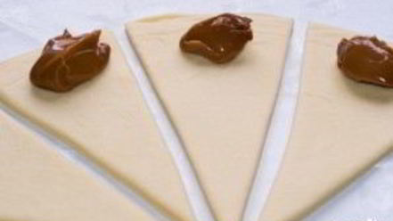 На каждый из кусочков положите немного вареной сгущенки. Ее можно заменить чем угодно. Например, подойдет варенье или свежие фрукты.