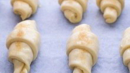 Скатайте тесто в рогалики. Выложите готовые изделия на противень, застеленный пергаментом. Затем смажьте круасаны взбитым с сахаром яйцом и присыпьте коричневым сахаром. Выпекайте при температуре двести градусов двадцать минут.